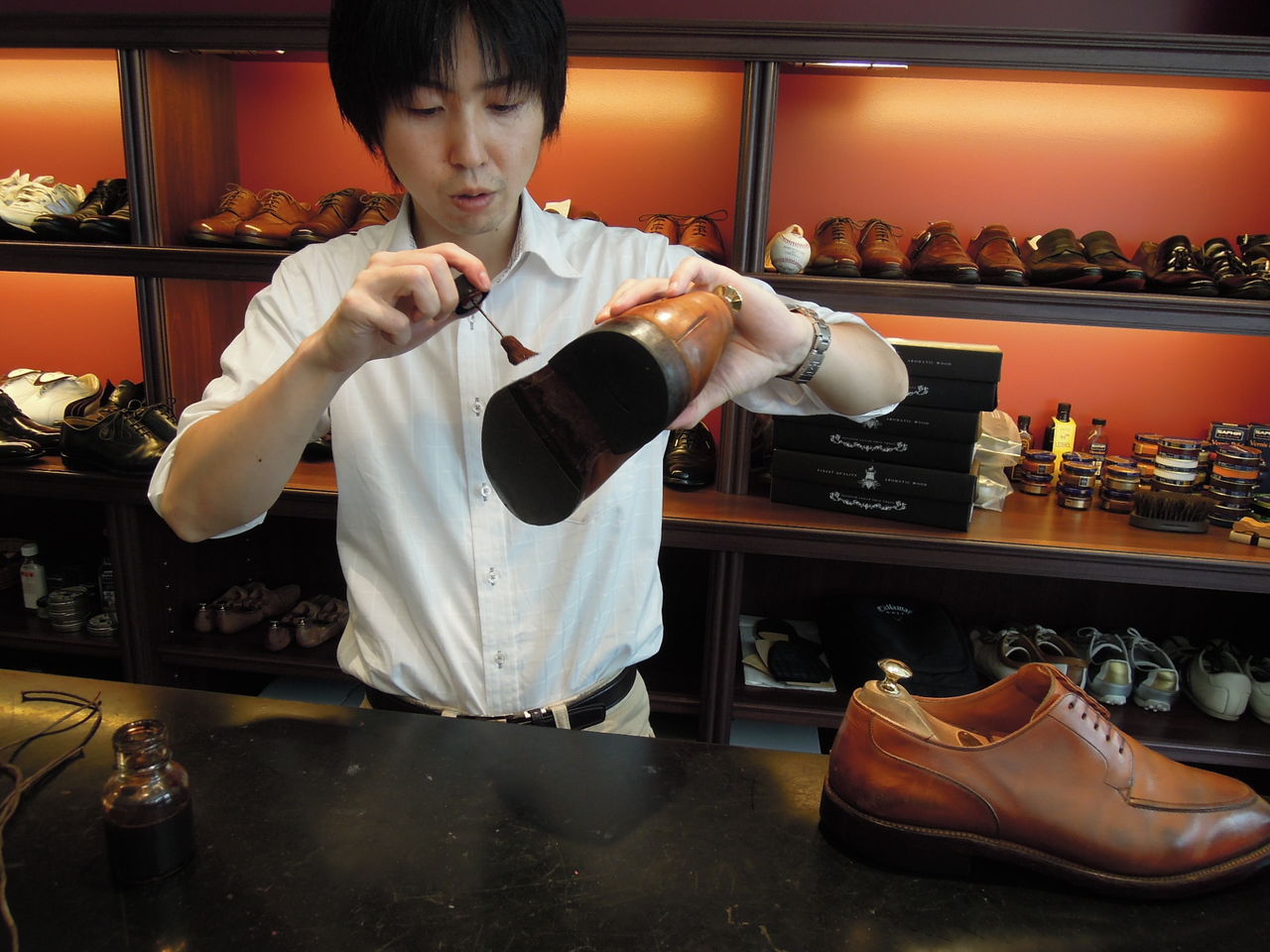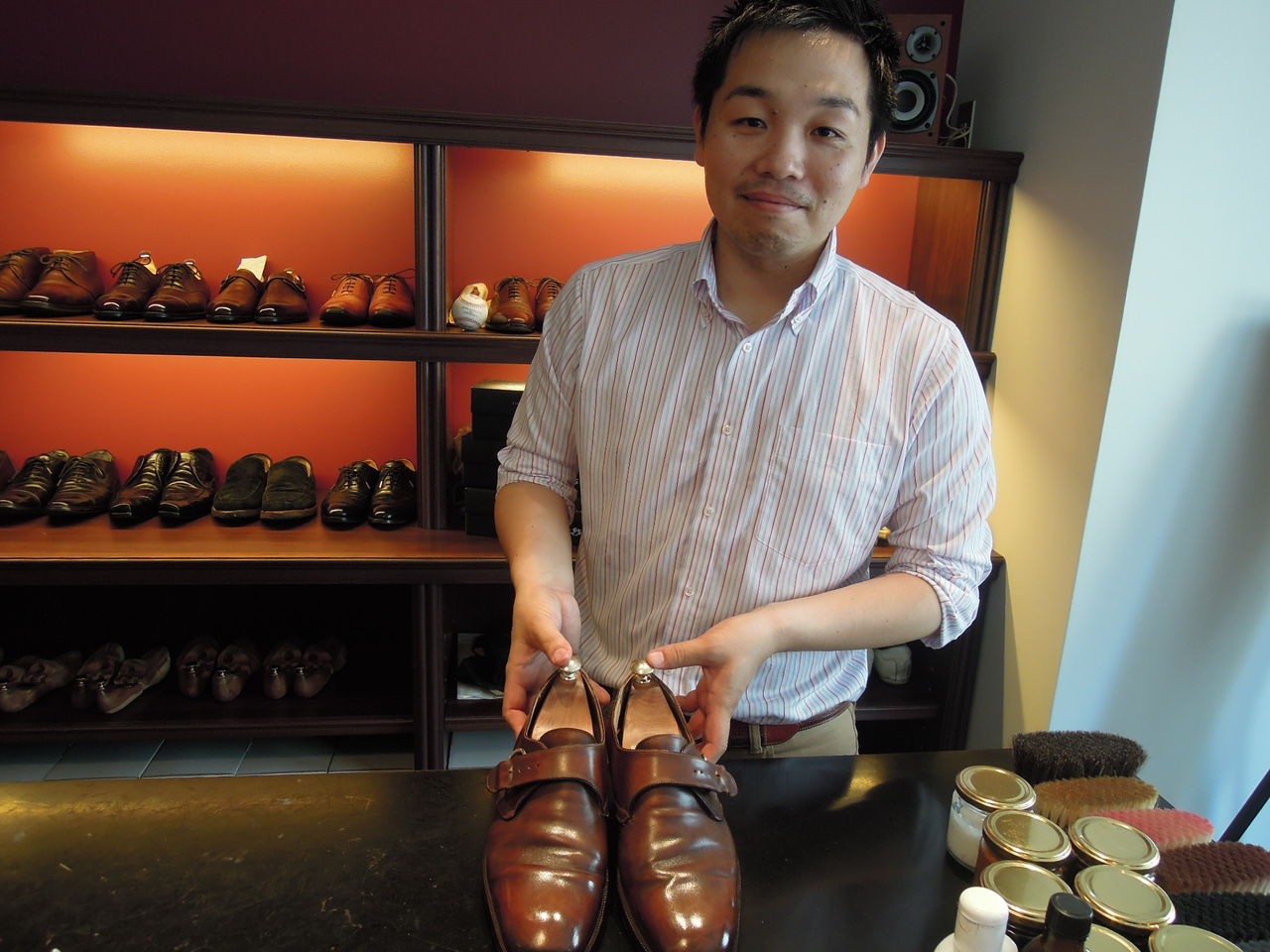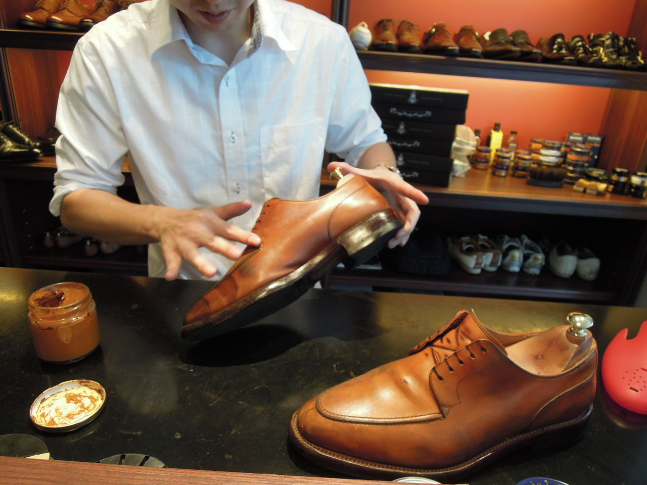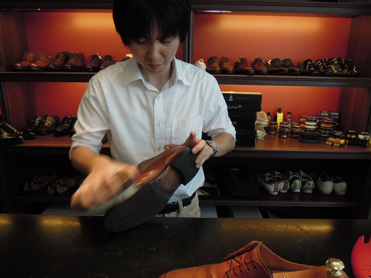 以前名古屋のオーダー靴店シューズボナンザさんにハイシャインという靴の磨き方を教えてもらった。サフィールの靴クリーム、つや出し、そして馬毛ブラシ豚毛ブラシ、クリーム用ぶらし2種を買い、時間があれば靴を磨いている。黒靴はなんとかできるが茶の靴はしろうとの悲しさで上手に磨けない。そこでお客様に教えてもらった昨年末できた靴磨き専門店名駅「ゴッチ」に出かけていった。持っていった靴はスコッチグレインのフランス鞣しの革をつかった外羽根靴とフィレンツェマンニーナで10年前に買ったモンクストラップ。ゴッチさんは柳橋交差点を南に一本行き西に入ったところにある。こぎれいなブティック風店内に入るとバーカウンターがしつらえてあり靴磨きの様子が見えてとても楽しい。靴談議しながらカウンターに腰掛け待つのもいいもんです。コバもキレイに染めて、クリームも手で丁寧に塗り、磨き込む。やはり素人のわたしがやるのと全然違うできあがり。