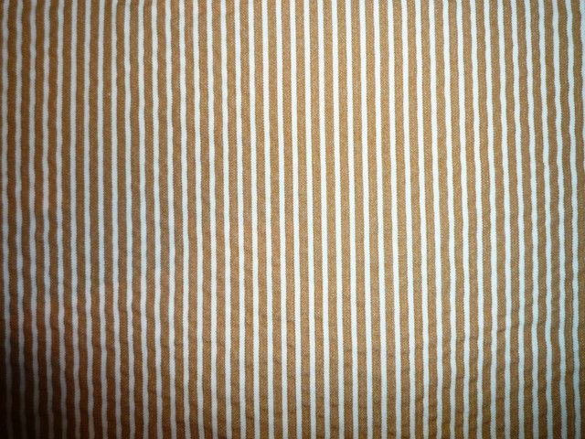 上の素材のベージュ。縦縞でうねが波打っているコットン素材をサッカーという。接触する面が少ないため感触がべたっとせずこれも盛夏の素材ということになる。