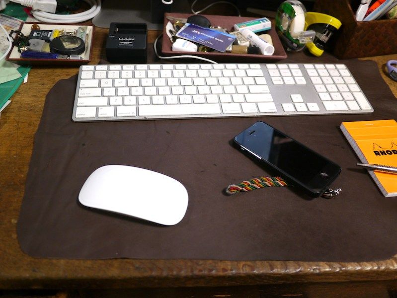 机まわりの整頓は快適に仕事をするためときどき行う。今回大きめの牛革が手に入ったので適当な大きさにカットしてハンドメイドのマウスパッドを敷いた。マウスのすべりもよくなり、そしてなんか書斎っぽくなり焦げ茶なので温かい雰囲気になった。