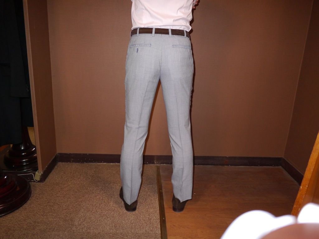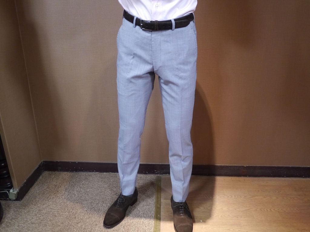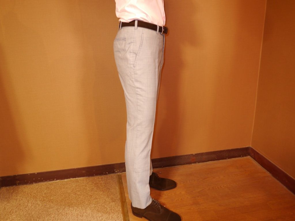 スーツはジャケットとパンツで成り立っています。テーラーはともすると上着を美しく仕立てることに重きをおき、パンツを二の次にする傾向にあります。しかしスーツスタイルはパンツのかたち・ラインの美しさ・適正な長さが「基礎」になり美しさが決まって行きます。いくらシワ一つない完璧な上着を着ていても、パンツが長過ぎて靴のところでたるみが多く出ていたらスーツスタイルは台無しとなってしまいます。パンツ少し長めだと足が長く見えるという「誤解」がありましたのでこういうスタイルを今でも良く見かけます。スリムで美しいスーツスタイルを目指すならまずパンツの丈を見直してください。これはオーダーだけでなく既製品を買う場合にも通用しますのでスーツを買う際、パンツの長さのフィッティングは長過ぎないよう注意を払ってみてください。でもここでちょっとオーダーの優位性を言うならば、長さだけでなくスソ巾、ダブルの巾の指定が出来るのでよりすっきりみえるのです。