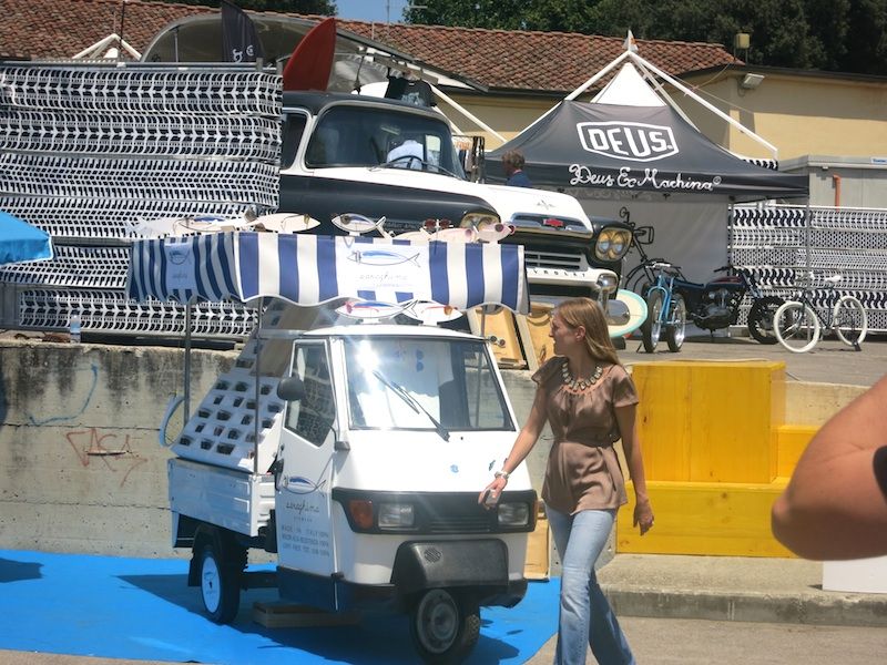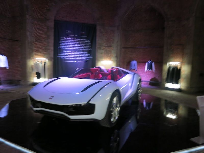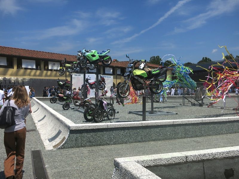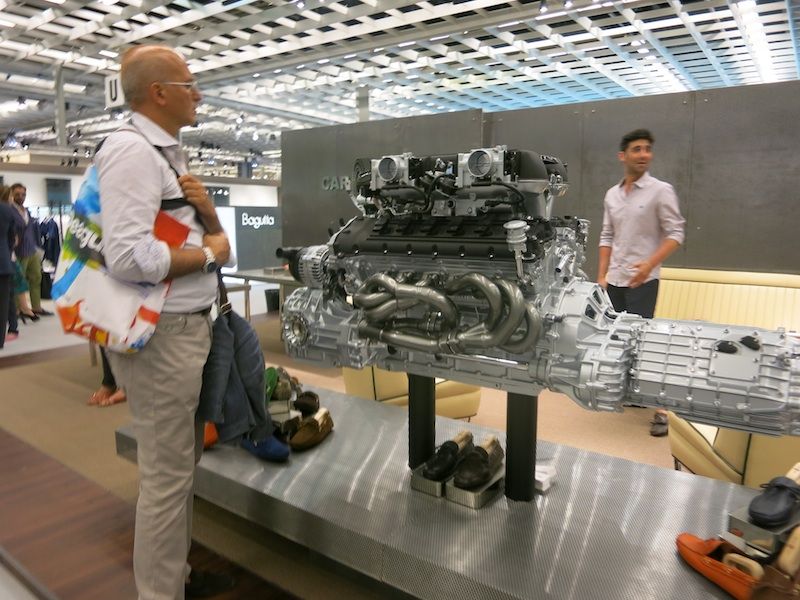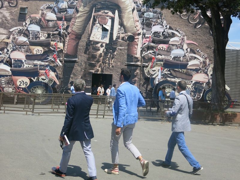 まずフィレンツェの中央駅であるフィレンツェサンタマリアノッヴェラ駅に着いたら休日の繁華街のような人の多さで観光地として世界的人気の高さを再確認した。そんな駅の雑踏の中に身なりのきちんとしたジェントルマンや雑誌LEONなどからでて来たようなワルぶった装いの方々が多かったのでピッティの人気は衰えていないと感じた。今回フィレンツェは先週まで涼しかったのに熱波が到来して摂氏35度を越える暑さで直射日光があたる場所では間違いなく40度を軽くオーヴァーしていただろう。サンタマリアノッヴェラ駅から徒歩で10分たらずのピッティウォモ会場である中世の要塞跡であるバッソ要塞までの道すがら汗が流れ出してくる。サングラス率7割を越え、いつもは夏でもジャケット姿をよく見るピッティ会場だがシャツ&パンツ姿ばかり。わたし自身きちっとネクタイをしめてジャケットパンツで出かけたのだが昼を過ぎたときふっと気がつくと裏地を貫通してジャケット表面が汗で濡れていた。ピッティ取材に集中していて暑さを忘れていたのだ。シミになってはいけないのであわてて脱いだ。ピッティ会場でも日差しの強烈な外には人は決して多くないのにエアコンの効いた室内の中は人でにぎわっていた。今回のテーマはファッションとモータースポーツらしい。メイン会場の前には疾走するバイクのディスプレイがある。また様々な場所でモータースポーツにちなんだ展示もある。衣食住に足りたら良い車に乗りたいし異性に好まれる装いをしたいというのが人情でファッションとモータースポーツは密接な関係にあることはまちがいない。
