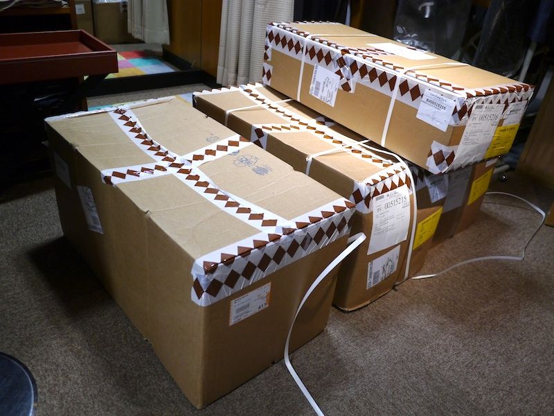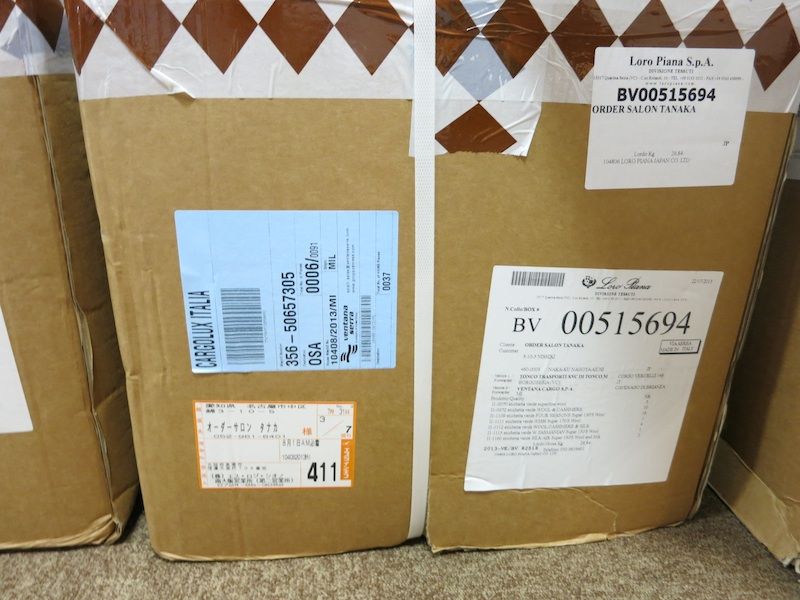 9月になると本格的な秋冬素材オーダーがはじまるがその準備をすべく今月は秋冬物が入荷する。今日、まずロロピアーナから大量の荷物がマルペンサ空港からの航空便で到着して店のスペースの真ん中を占領している。荷物が着いたと言ってもすぐ展示できるわけではない。伝票と照合の上一点一点検品をする。秋冬ずっと販売して行く大事なものだから丁寧にあつかわなければいけない。これからはイタリアからエルメネジルドゼニア、カノニコも入ってくる。英国からはドーメルもヨークシャーの生産拠点から発送のEメールが届いた。なんとか8月下旬までには皆様にご覧頂けるように準備をすすめていきたい。