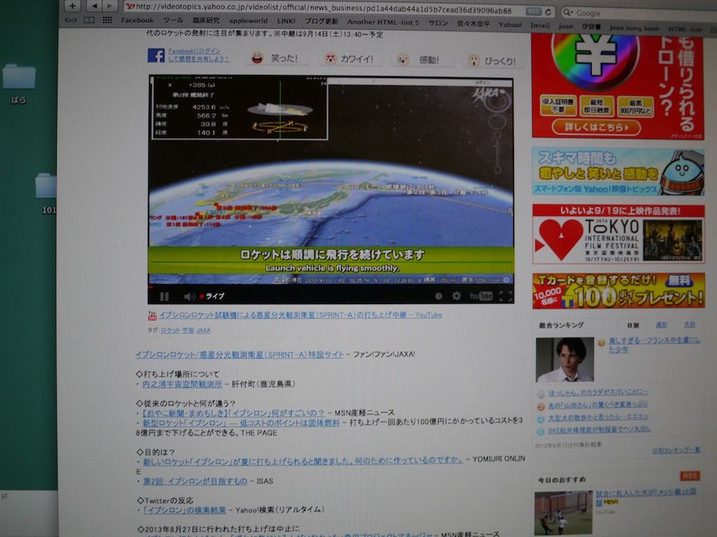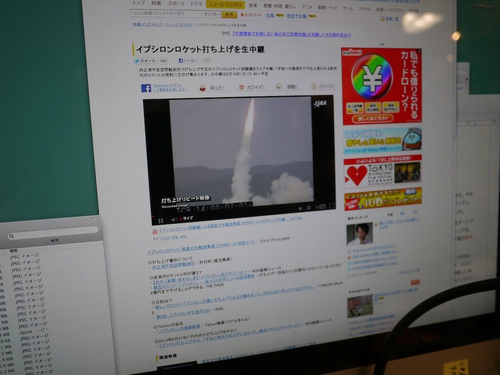 イプシロンロケットに実は注目していた。8月27日の打ち上げに期待したが中止になったときはちょっとガッガリしていたので今日はなんとか成功してほしいとおもっていた。お昼過ぎ、お客様とお客様との合間ふとウェブをのぞいたらロケットの打ち上げまであと2分だった。ライブ画像があるとのことで見てみたら、サーバーにアクセスが多くてつながらない。あーあと思っていたらすぐつながり、もうドカアアアアアアンと発射。ウェブのガタガタの荒いライブ映像とはいえロケットが宙に発射されるスピードは驚くほど早い。みるみる空に舞い上がる。おおおっとおもっていたらちょっとずれている気がする。心配だ。でもアナウンスは成功したといっているので成功したんだろう。ときどき解説が入るのでわたしのような門外漢にもよくわかる。二段目が点火とかときどきドキドキしながら見ていると十数分で南米までチリまで着いてしまう。飛行機なら十何時間もかかるのに、すごいすごい。すごいスピードで飛んでいるロケットから画像も送られてくるのもびっくりする。日本の科学技術ってのは凄いことになっているんだなあとあらためて思い、日本がんばれ、ロケット飛べ飛べという気持ちが高揚する。とはいえどこで問題が出るかも判らないのでヒヤヒヤしながら手に汗にぎりウェブの画面を見つめる。フェイスブックでともだちのパヤさんが現地にいっていて森の向こうからドカーンと飛び出して大歓声が上がる映像もおくってくれてそれも感激。するとお客さんが来て、打ち上げ鑑賞終了でした。接客を完了してウェブをみると衛星切り離し成功との事。ほっとしました。