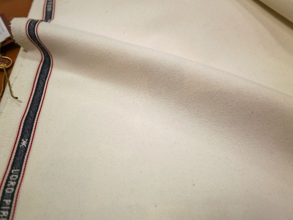 今回、アメリカ合衆国、カリフォルニアのサンホアキン渓谷において有機栽培メソッドで育ったコットン100%を使った素材「デニムフラワー」を新発売しました。通常、ウール素材は毛織物工場、コットン素材は綿織物専門工場で織ますがこの素材は毛織物専門工場であるロロピアーナ社内で生産されました。ロロピアーナ社の紡績、毛織技術を活かしこの表面に美しい起伏がある1mあたり560gのしっかりしたそして自然な風合いのデニム地が織りあげられました。織物の端にロロピアーナの耳(セルビッチ)が入っているのがその証。今回このオーガニックコットン素材ロロピアーナ「デニムフラワー」のパンツをスペシャルプライスでオーダーいただけます。デニム地といっても5ポケット仕様ではなくクリースラインの入ったパンツのオーダーでおすすめしています。色はナチュラルホワイト、ナチュラルベージュ、ソフトインディゴブルーの3種類を数量限定で御用意いたしました。自然な色合いのパンツを秋のおしゃれに加えてみてはいかがですか?