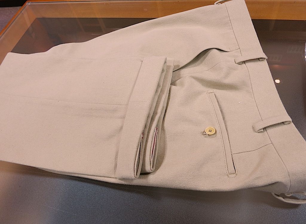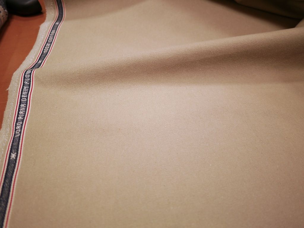 この素材は美しい耳(セルビッチ)が入っています。ロロピアーナジャパンの担当者となんとかこの耳を活かせないかと話しました。一つのアイディアとしてパンツのウェストのループ一本にさりげなくこの耳を使ってみることもできます。