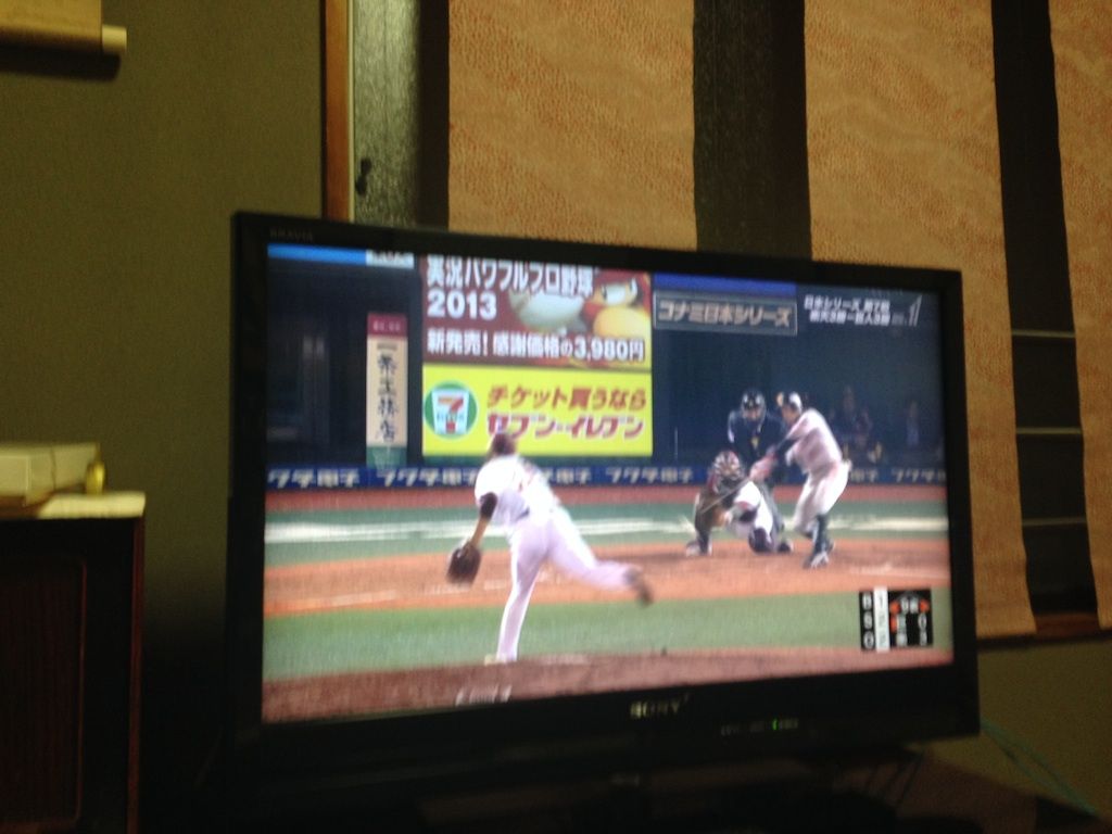 幸せな気分にはもうひとつの理由がある。豚の焼き上がりを待ちながらテレビで日本シリーズの巨人楽天を見る。秋も深くなり仙台クリネックススタジアムは冷たい雨が降る中、日本一の名誉をかけて最後の闘いに両軍が挑む。三勝三敗で迎えどちらが有利とはいえないノーガードの闘い、勝てば官軍まければ賊軍に選手の顔は蒼白で目は充血している。やはり潤沢な資金と国民的人気を誇る巨人よりまだ新しいチームで東北の復興を背負った楽天の肩を持ってしまう。楽天の選手はマー君以外ほとんど知らなかったが、高貴な名前をもつ俊足で身体能力の秀でた聖澤、みずからも被災者だったファイター銀次、すばらしい球を投げる則本など魅力的な選手ばかり。柔らかく味わい深くしあがったポークを食べながらことしの野球の千秋楽をちゃぶ台囲んで楽しんだ。