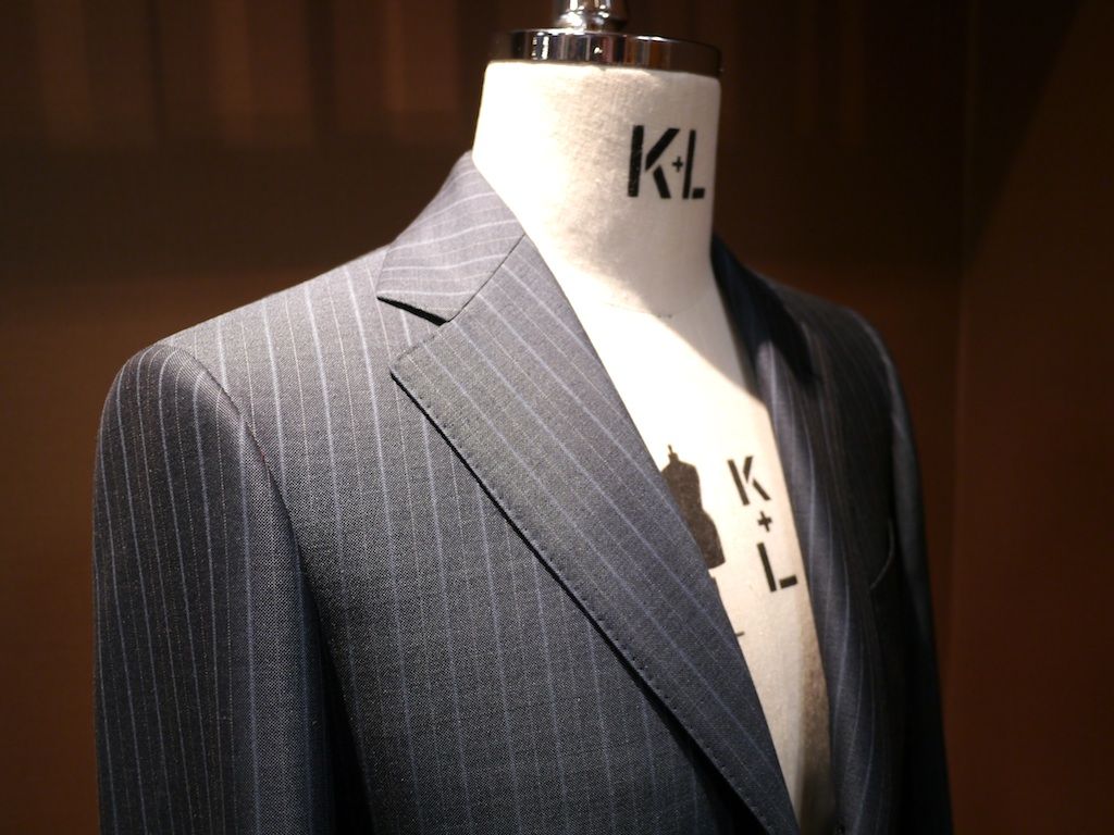 ただパターンの美しさを保持する必要性と着用感を保証し縫製しやすさを保つために寸法の指示、サイジングを変えても変わらない部分が存在する。上えり(カラー)の形状、アームホールの形状、ラペルの曲線、フロントのカッタウェイの曲線などはサイジングでは変更できない部分である。今回、新しいパターンは旧来のパターンの改造ではなく一から線をひきなおした物である。とはいえクラシックスーツという伝統により育てられた形状はそう変わるものではない。お客様が体感できる変化はこのサイジングで変わらない部分だとおもう。この部分の変化については明日のブログでお話しします。