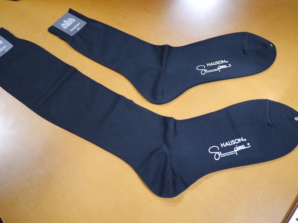 スーツにはく靴下として一番正式なものといえばホーズである。すねも見えず、ずりおちることがないためスーツスタイルでホーズを履いているととても引き締まった気分になる。当店も10年以上前から日本の靴下メーカーの雄「ハリソン」社のホーズをお客様にご紹介して来た。ほとんどのメーカーが中国に生産を移管している中、真摯に日本国内、加古川で生産する姿勢は貴重である。わたし自身もそんなハリソン社のホーズを愛用していたが、最近困った事がある。それはクラシックスタイルでもパンツがスリムに、たとえばひざ幅22cm前後、スソ幅19cm前後になってきて、ホーズを履くとパンツのスネが引っかかるのである。それでパンツの裾がずりあがって来てしまうので、近頃はホーズを履く事を諦めてユニクロの黒いコットンソックスを不本意ながら履いていた。そんな悩みを大学の先輩でもあるハリソンソックスの窪田哲弥氏に投げかけてみた。それなら、当店でも扱っているスーピマホーズと同素材の短いソックスにしてはどうかという提案があった。平織りでいわいるナイロンソックスと同じ程度の薄さだが素材はスーピマコットン80%ナイロン20%の高品質である。とりあえず一足購入して実際に履いてみた。やはりレースアップの靴には足がスッと入り当然だが足は引っかかる事はない。これは快適なので当店でも販売することにした。本来ならホーズがいいがちょっと妥協してもこれならパンツのスソはホーズにひっかかりません。