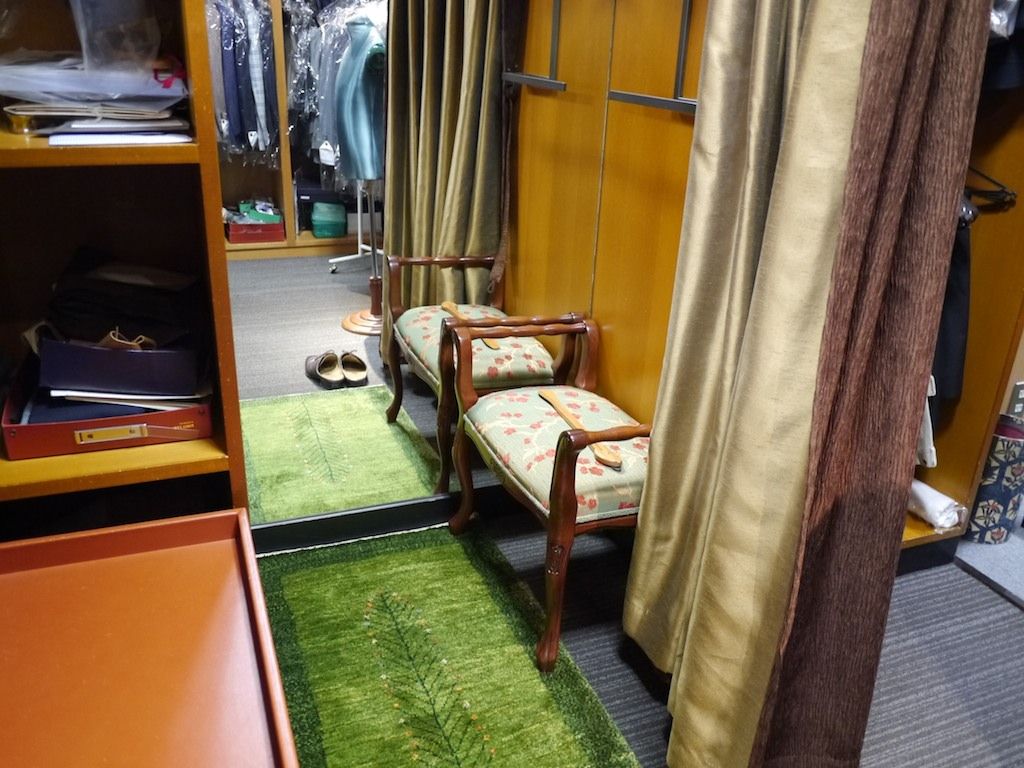 靴下の話とは変わるが当店のフィッティングルームは採寸時、ゲージとして使うパンツに履き替える場所でオーダーの際にとても重要な場所だと認識している。非常に狭い場所ではあるが、お客様にエレガントな気分になっていただくよういつも「しつらえ」を考えている。二日前、家具店で小さなベンチを見つけたのでフィッティングルームに置いてみた。今朝、はじめて使っていただいたお客様に聞いてみたが評価が高かった。