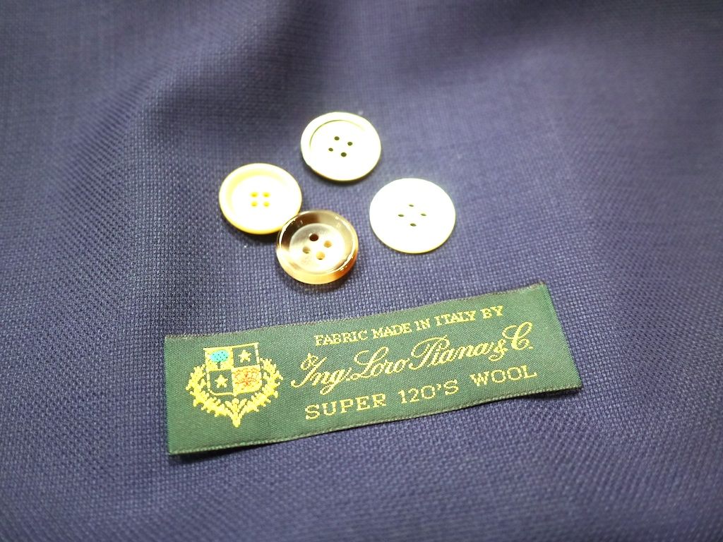 当店のロロピアーナ素材はすべて正規輸入品。織り耳も付き、タグはテーラーマーケット用のグリーンタグ。ボタンは水牛かアイボリーのナット、シェルボタンが良いでしょう。
