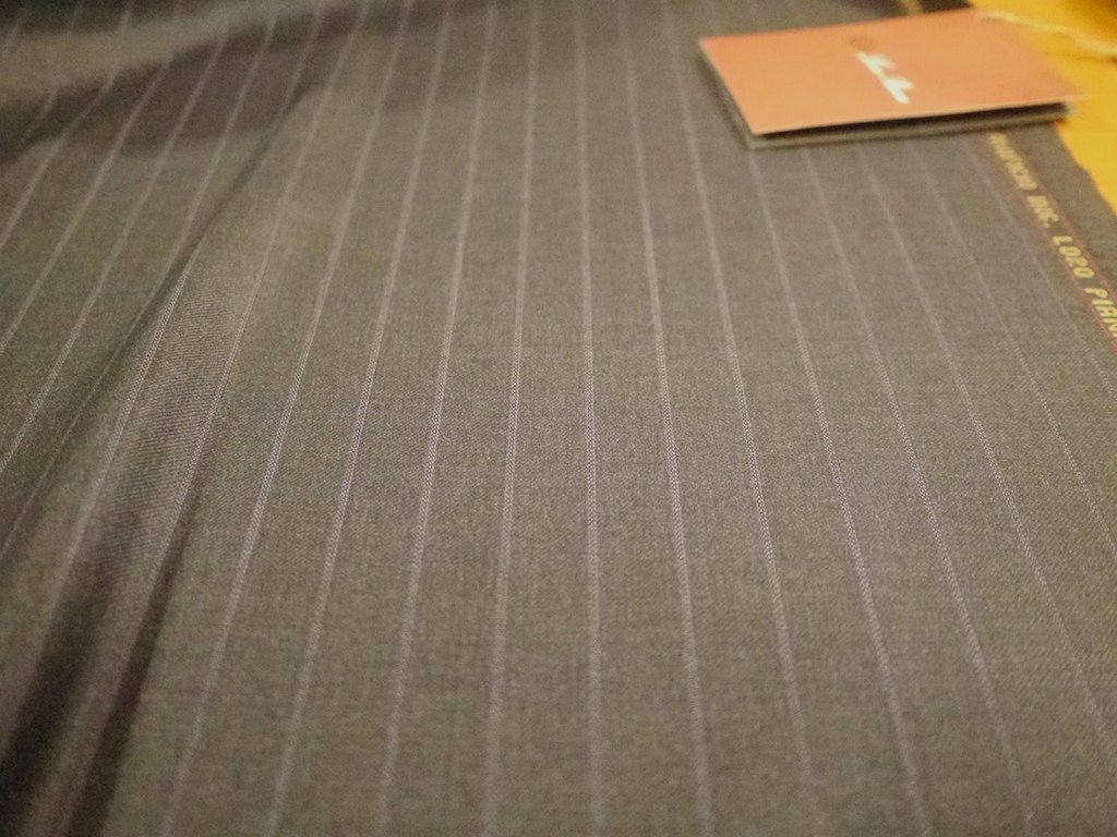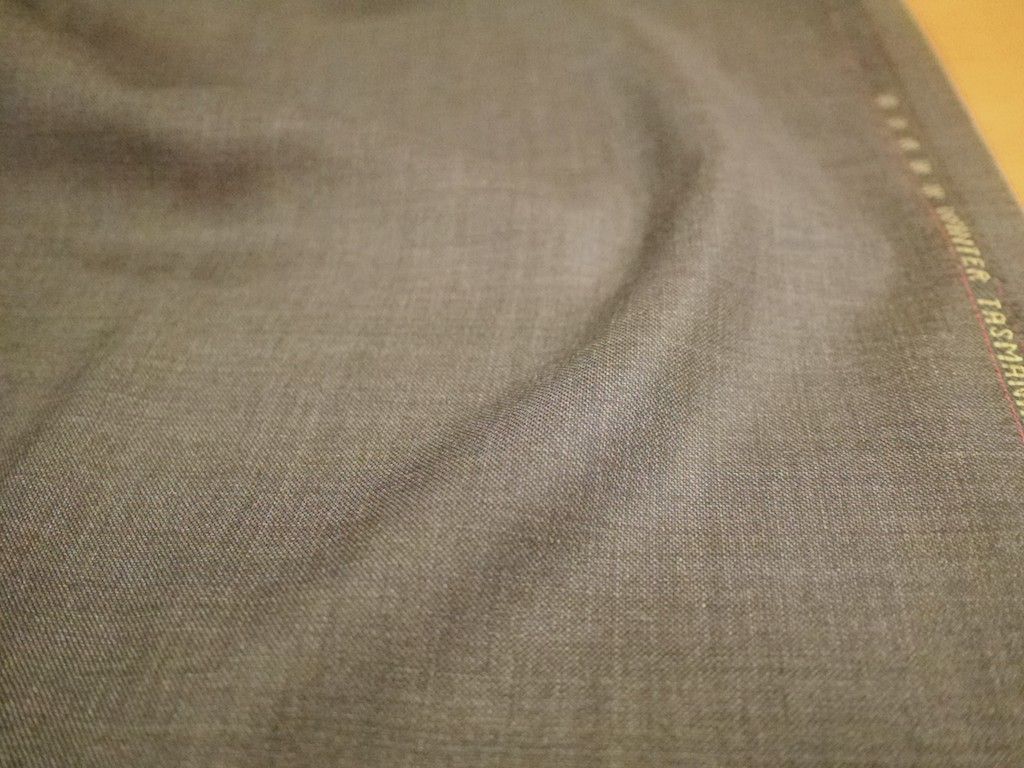 ウインタータスマニアンはエキストラファインメリノウールのスーパー150`グレード原毛を100%使用しています。スーパー150`とは繊維の平均繊度が16.0ミクロンの原毛のことでメリノウールの故郷、オーストラリアでもとても希少で高価な原毛です。通常このような高価な原毛で織物を作る場合、1mあたりの使用量を250g前後と軽めにすることが多いようです。軽くなる一方でコストダウンにもなります。しかし冬物素材に必要な目の詰まったしっかり感はなくなりますので防寒性能や耐久性には問題がでます。ウインタータスマニアンはそういう流れにさからって1mあたり340gとスーパー150羊毛を世界で類を見ないほどふんだんに使い、細い96番手の糸をダブルワープでしっかりと厚みをつけて織り上げています。目が詰まっているのに柔らかさがあり、ツヤも美しい。そして紳士服地に必要な強度も十二分に備わっている。だからロロピアーナ・ウインタータスマニアン150は「日常で着られる世界最高品質の紳士服地」と称されるのです。