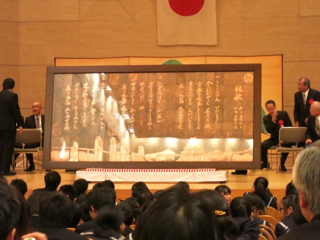 50周年記念に生徒達で一枚ずつ分けて彫った校歌の壁画。名古屋の高層ビルの間に立つ学校の景色も彫られている。