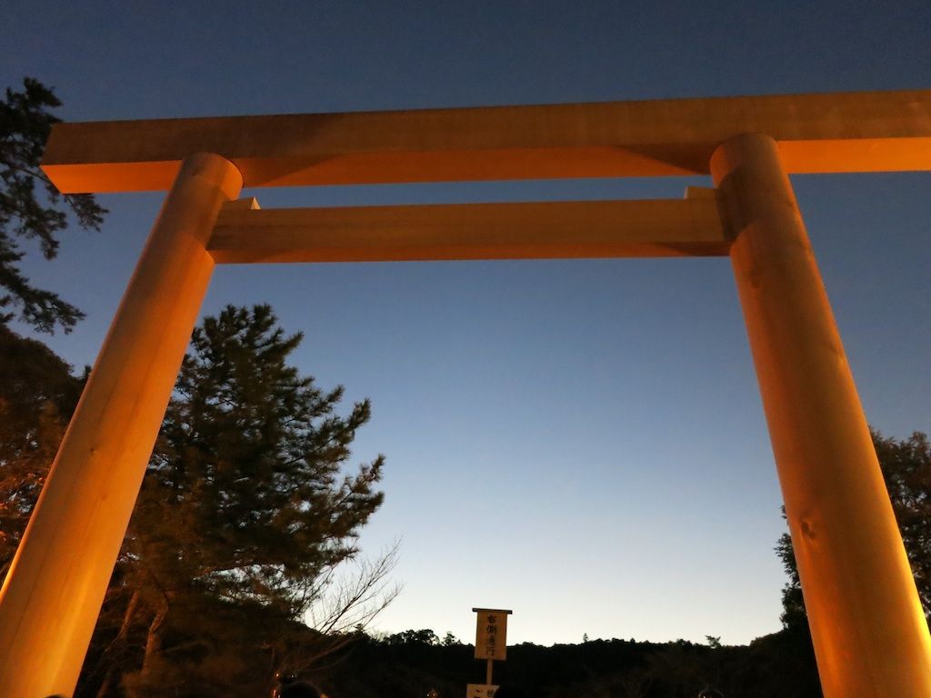 初日の出直前の宇治橋鳥居、白木の鳥居がなんと朱に染まる不思議さ。