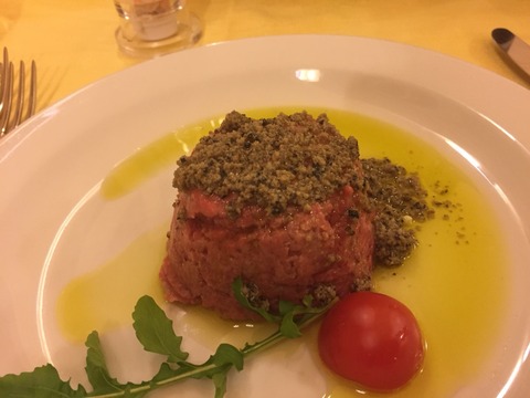 曲がりくねった坂道に並ぶのは石造りの建物。日本には古い建物が残る街はあるが、イタリアのように「歴史的地区」と限って新しい建物が純粋に一軒も無いところは無い。ここで映画のロケでもすればすぐに中世が舞台の映画などできてしまう。岩の台地を端から端まで歩いてオルビエートの街の大きさを感じる。だあれもいない曲がりくねった小道を歩きながらいにしえのイタリアを想像したり、こういう美しき街を訪れることができた幸せを感じたりする。そうこうしていると予約したトラットリアに行く時間となる。中世に建てられた時計塔のある石造りの屋敷の片隅がトラットリアになっている。入り口すぐの席がストレンジャーの定位置。初対面のアジア男がいきなり奥に通されても変な気持ちになる。入り口近くが旅の者としては落ち着く。ガス入り水とともにまず選ぶのがオルビエート名物の白ワイン。普通のものが一番うまいと思い、いつもヴィーノデラカーザ。上には上があるがぼくはそれで充分楽しめる。アンティパストとパスタと肉を選びまず出てきた料理に驚いた。皿の上にはプリンのようなピンクの小山にゴマのようなものが乗っている。フォークで崩してひとくち味わうとほとんど生肉のミンチの上に黒トリュフの刻んだのが乗っている。今日本ではご禁制となった生肉だが食肉文化が深いイタリアならではの一皿だと感銘。手作りパスタで作ったカルボナーラも白ワインに優しく寄り添う。遠くに動かさず原地で飲むワインは舌に乗せると微発泡を感じる。深い味わいの葡萄酒に陶然となりながら夜が更けていった。