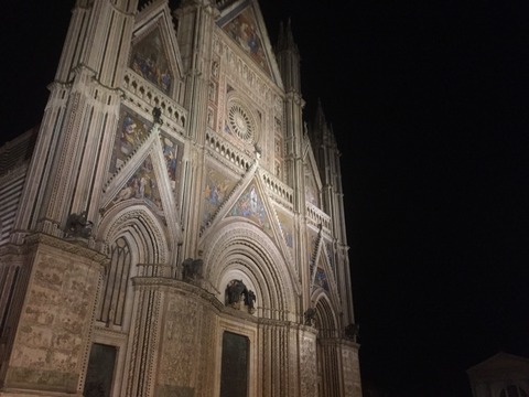 ピッティイマジネウオモの開催されているフィレンツェを後にしようとフィレンツェサンタマリアノヴェラ駅に向かう。電車は15時9分発だったので切符を買おうと売り場を見ると長い列。こんな時は自動券売機か近く場所へならキオスクでも売っているのでオルビエート発を買う。特急フレッチャロッサなら40分の街を準急は2時間かけていく。きついなあと思いながら乗ってみると車窓から見えるトスカーナとウンブリアの田園風景が楽し山の上に街があるのを眺めたり途中で見える大きい湖に驚いたり、テルメという途中の駅名にどんな温泉なんだろうと想像している時間の経つのを忘れる。イタリア語のぶっきらぼうなアナウンスにオルビエートの名前を聞いて到着を知る。オルビエートは駅からかなり高い位置にある岩の台地に並ぶ中世の街並みで有名、一度来てみたかった。