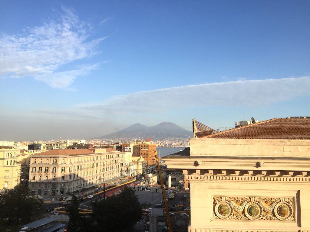 ナポリは丘の町でもある。高いところから町をながめると市街地、海、そしてあの有名なヴェスビオ火山が見える。人口密度が高いため坂の細い路地にぎっちり建物がならび大きい建物はべんがら色に塗られているものがおおい。タクシーにのると町並みにとても変化があるのがわかる。