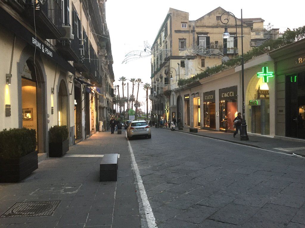 ナポリ人はまちがいなく洋服が好きな人たち。市街地にならぶお店は洋服関係が圧倒的に多いのは旅行中のブログに書いた。トレド通りからはいった歩行者天国になっているキアイア通り(歩行者天国なのでグーグルで見られないのが残念)を歩くと洋服屋やスイーツ屋が軒をならべ楽しくなってくる。キアイア門をくぐってちょっと行くとこぎれいな並木道となりエレガントなお店も増える。並木が途切れたところを右に曲がるとエルメスなどラグジュアリーブランドが並ぶ通りになり、海の方に歩くとカラブリット通りをへて有名なネクタイ店マリネッラがあるヴィットリア広場にでる。ミラノモンテナポレオーネより洋服好きならきっとこの周辺のほうが魅力的な店がおおいのでないか。