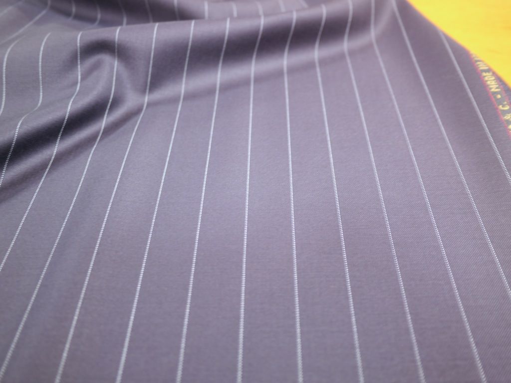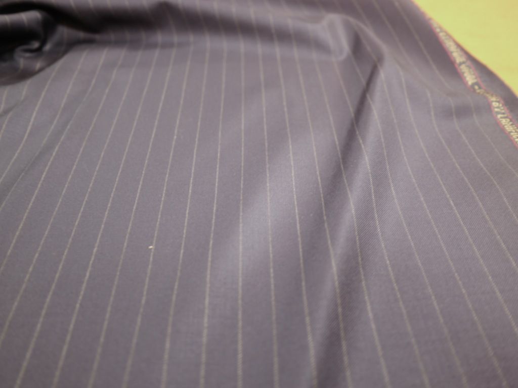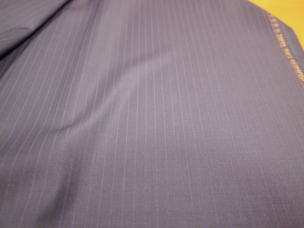 チャコールグレーにチョークストライプ。濃色だとまたツヤが引き立つ。