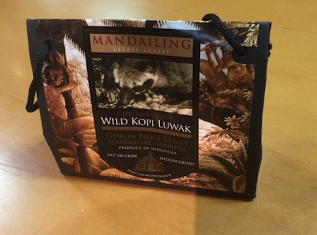 やまちゃんがおみやげに持って来てくれた世界で一番高価なコーヒー「コピ・ルアク」インドネシアのコーヒー農園ではロブスタ種のコーヒーが栽培されており、その熟した果実はしばしば野生のマレージャコウネコに餌として狙われている。果肉は栄養源となるが、種子にあたるコーヒー豆は消化されずにそのまま排泄されるので、現地の農民はその糞を探して、中からコーヒー豆を取り出し、きれいに洗浄し、よく乾燥させた後、高温で焙煎する。話しには聞いていたが飲むのは初めて。