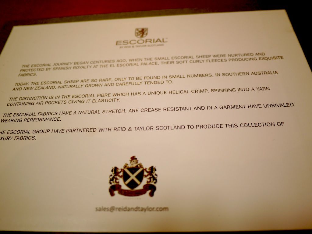 エスコリアルという素材を見つけた。エスコリアルウールとは北アフリカはモロッコ南部アトラス山脈が原産地のミニチュアシープの羊毛。スペイン、マドリッドから45km離れた街に王立サン・ロレンソ・デ・エル・エスコリアル修道院と広大な宮殿、修道院、博物館がある。エスコリアルウールは16世紀以来そこで飼育され王侯貴族のみが着用を許された門外不出の羊毛だった。その後ナポレオン戦争にともなうスペイン王国の衰退とともに絶滅したと思われていたが、当時スペイン王国は親族や他国の王族に向けての贈り物としてこのミニチュアシープを贈っていてその末裔の純血種がタスマニアとニュージーランドで生き残っていた。現在この原毛は英国の紡績会社が幹事役となりエスコリアル協会を作りリード&テイラー、テイラーロッジ、ジョンフォスターなど6社のみ原毛を供給しこのエスコリアルという素材の正統性を保っている。