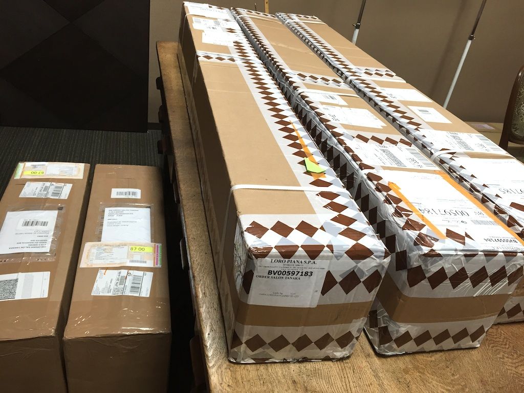 今日はほんの一部がロロピアーナ社から届いた。オーダーしたのはこの10倍以上。まだまだこれから届きます。