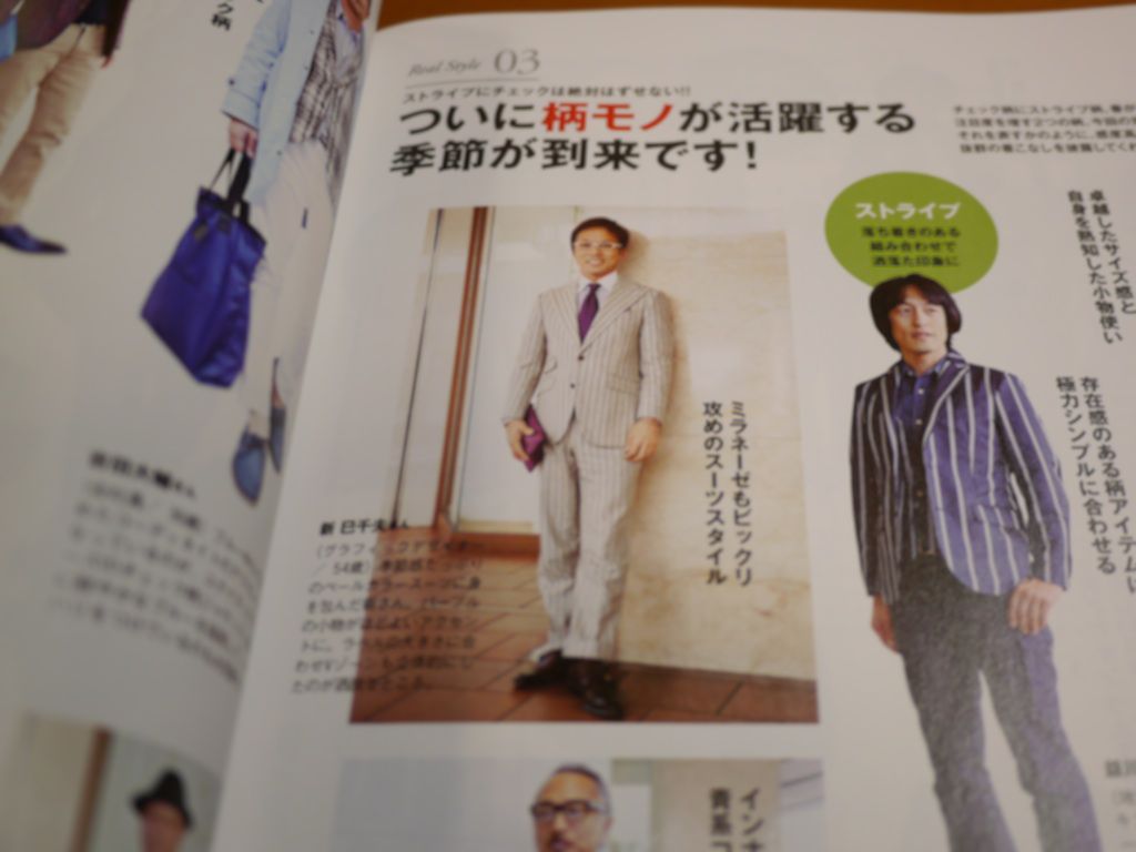 今日の朝ご来店いただいたお客様Aさん、先般スーツスタイルのスナップをメンズクラブ誌に掲載されたとそのメンズクラブ6月号をいただいた。当店で仕立てたベージュにブラウンストライプ、太巾のピークラペル、スラントチェンジポケットの粋なスーツをばっちり着て感じ良く決めている。これも嬉しいご評価です。