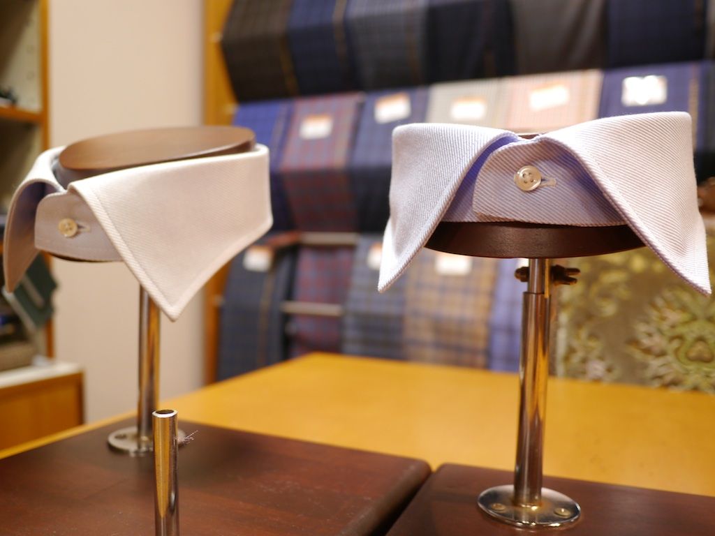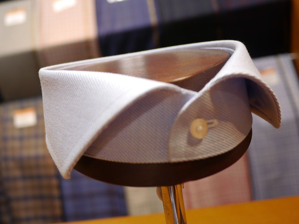 当店がおすすめしている最も「クラシックスタイル」にふさわしいシャツのカラーの形はややワイドでボタンから衿先にかけてゆるやかに丸みを描きそして外側は逆のラウンドがついているシェイプ。ネクタイと美しくマッチして肩甲骨のでっぱりもやさしく逃がします。そして今回身体が大きくない方のために全く同じスタイルでカラーの先を7mm小さくしたものを追加いたしました。