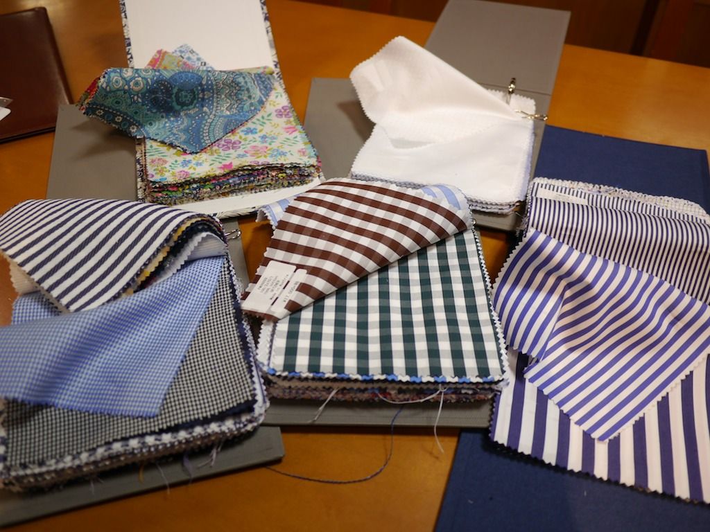シャツの採寸は基本メジャーでおこないますが、必要に応じて用意してある30種以上ご用意してありますサンプルのシャツをゲージとして使用し着用感を試し、サイズを決定しています。