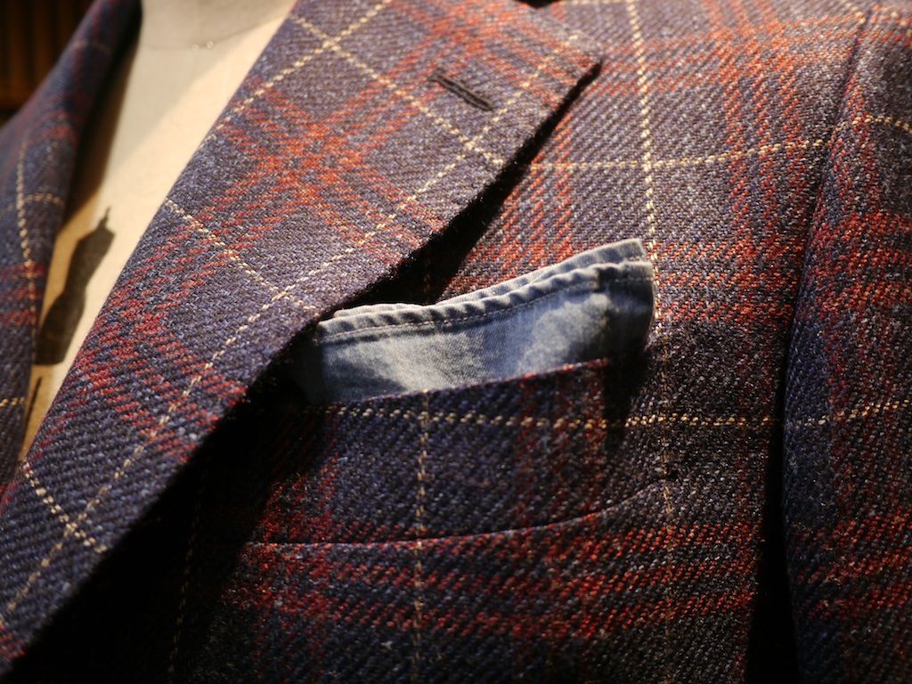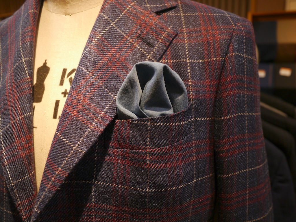 当店でカジュアルスタイルのコーデに人気のあるコットン100%デニムオーダーシャツの素材でポケットチーフを仕立ててみました。タテ・ヨコ28cmで濃紺のデニム素材でポケットチーフを仕立ててからバイオブリーチ加工を施しました、だからチーフの角の色落ち感もあります。ジャケットの胸ポケットにあしらうとぐっとオシャレ感がアップします。