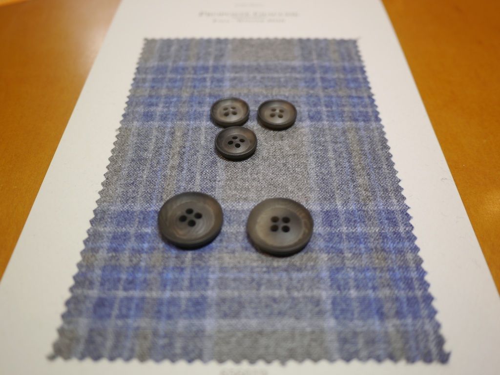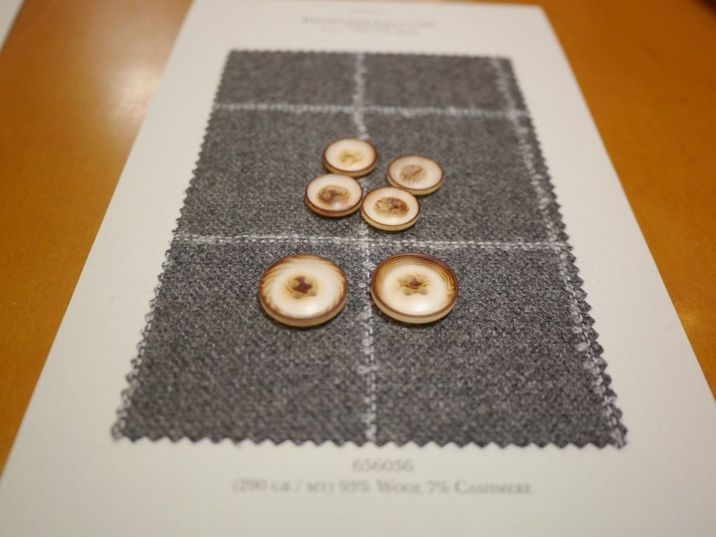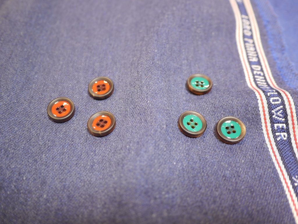 当店がお仕立てしたスーツ・ジャケットにはすべて天然素材を削りだしたボタンをオプション価格なしで標準装備しています。ボタンに使われる素材は木質のナット(象牙椰子)、水牛の角そしてシェル(高瀬貝、白蝶貝)。今回いままでのボタンに加えてナットのブルーとグレー、ナットのナチュラルとスモークしたものを追加しました。またロロ・ピアーナのパンツ、デニムフラワーのアクセントになるように水牛のボタンにペイントをあしらったボタンも追加しましました。秋冬物の楽しみがまたひとつ増えます。