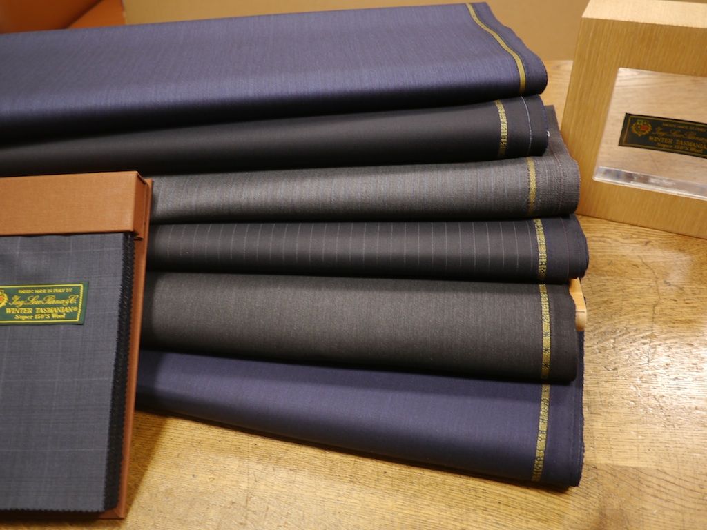 当店で秋冬素材の入荷で一番多いのがロロ・ピアーナ社のスーツ、ジャケット素材。ロロ・ピアーナの秋冬のスーツ素材といえばウインタータスマニアン150がフラッグシップモデルかもしれない。イタリアのスーツ素材といえばスーパー100以上の細番手羊毛を使った1mあたり250g?270gのライトウェイトな素材がどこのメーカーもリリースしている。秋冬のドレープ感もあり威厳のあるメンズスーツ素材のウェイトといえば320g?340gと考えられるがこのレンジでスーパー150の超細番手ウールを使ったスーツ地はウインタータスマニアン150しかお目にかかったことはない。やはりメーカーとしては高価な細番手羊毛を1mあたりたくさん使うことはコストが上がることがどうしても頭をよぎるのだろう。そういうコストを度外視して織り上げたウインタータスマニアンが柔らかさとしっかり感が高い次元でバランスがとれているのは自明の理である。仕立て上がったスーツはツヤがあり美しく日常着用できるスーツとしては世界一レベルといえる。英国スーツ素材について言えば1mあたり350g前後が多いが羊毛はもう少し太番手となりスーツを仕立てあがってみるとウインタータスマニアン150と比べるとややかたい味わいとなる。