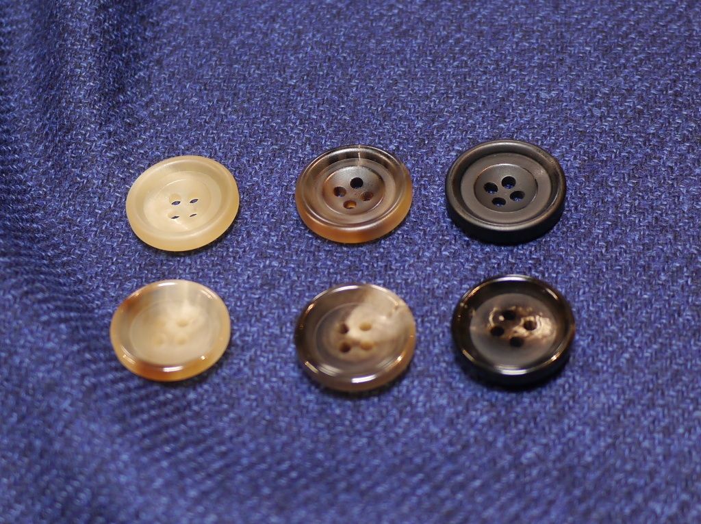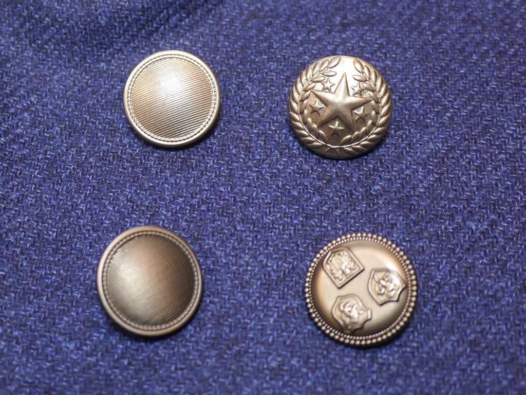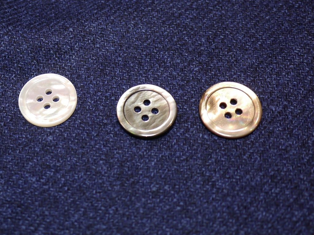 当店は水牛ボタン、象牙椰子でつくるナットボタン、貝のボタン(白のみプラス3000円)の天然ボタンを無料でお付けいたします。またメタルボタンも無料で用意しています。ボタン次第でジャケットのもつ雰囲気は変化します。あなたのブルージャケットのイメージにあったボタンをお選びくださいませ。