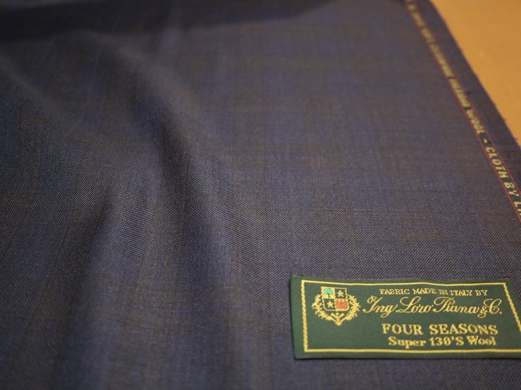 以前は禁じ手だった茶と紺を混ぜる柄、マローネ・エ・アズーロ(イタリア語で茶と紺の意味)が最近はちょっとしたブームですが、ロロ・ピアーナ社はこのマローネ・エ・アズーロのデザインが得意で、オシャレな柄を毎年発表しています。当店はマローネ・エ・アズーロのチェック柄でスーパー130`sの細番手羊毛を100%使い1mあたり250gの綾織で3シーズン着用できるスーツ素材FOUR SEASONSを反で買い付けスペシャルプライスでオーダーを承ります。紺をベースとしたツヤのあるなめらかな表面感で、チェックが目立ちすぎない落ち着いた柄で素敵な秋のスーツとなります。
