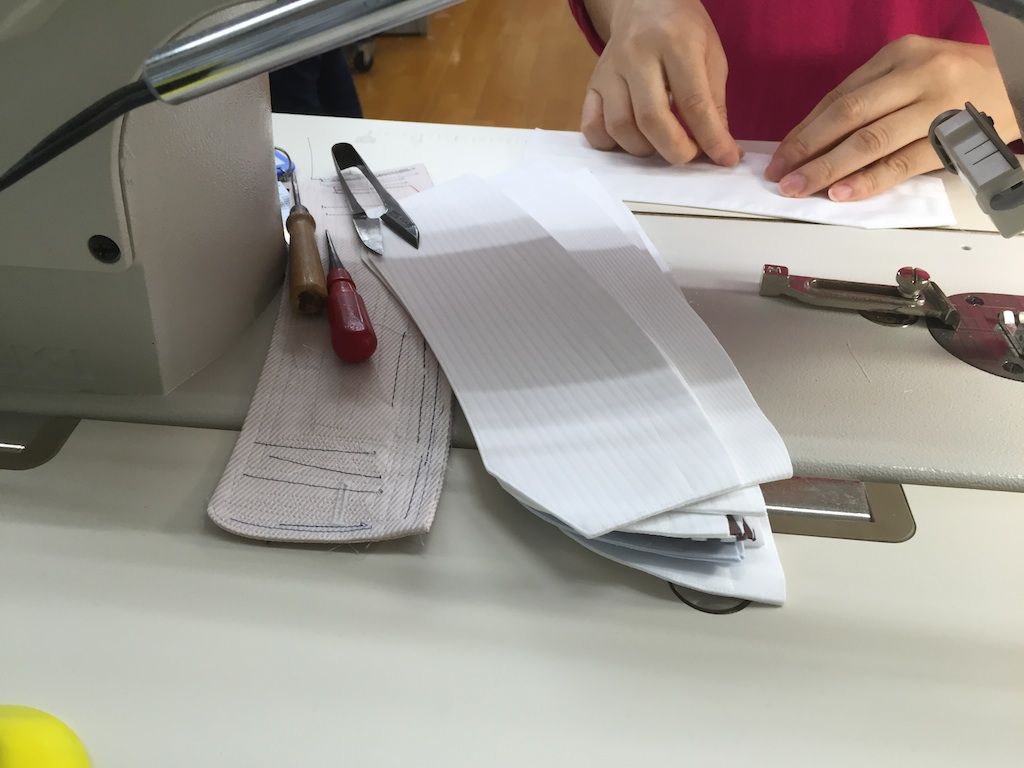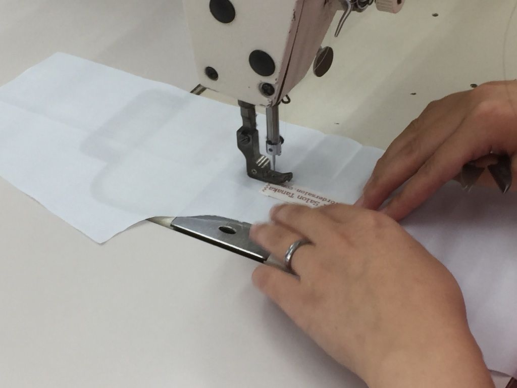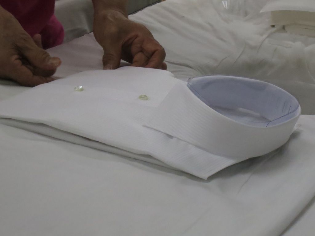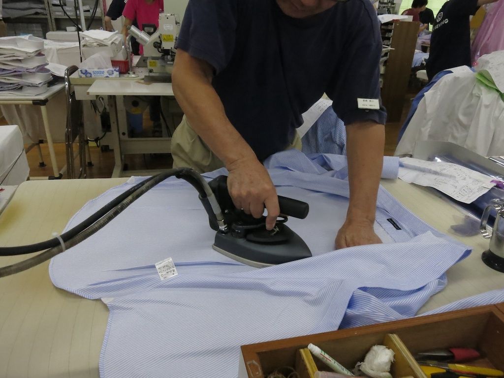 工場としては既製品とオーダーメイドを混在して作ったり、さまざまな仕様や素材を混在してつくったほうが営業的、ビジネス的には良いかもしれない。でもここは既成品のシャツは縫わないオーダーメイド専門の縫製工場。衿の工程は「フラシ」と呼ばれる衿の際を縫い付ける製法のみ。デパートのオーダーシャツ売り場であつかう樹脂接着剤で固めたようなトップフューズ芯は使わない。脇縫いはチープなシャツによく見られるロックミシン縫いや作業服などに見られる二本針ぬいではなく、縫い目を触っても手触りのいい「巻ぶせ縫い」の手法ですべてのシャツは縫われている。毛芯仕立てをがんこなまでに続けている当店のスーツ、ジャケットを縫う工場と同様、CADを使うことで指示に正確に裁断し、そして伝統的な手法工程を厳格に守る「品格の高い工場」だった。