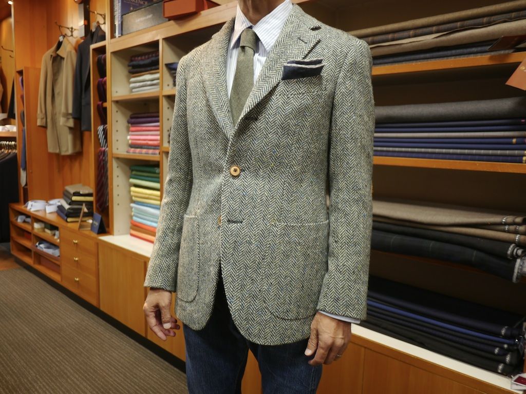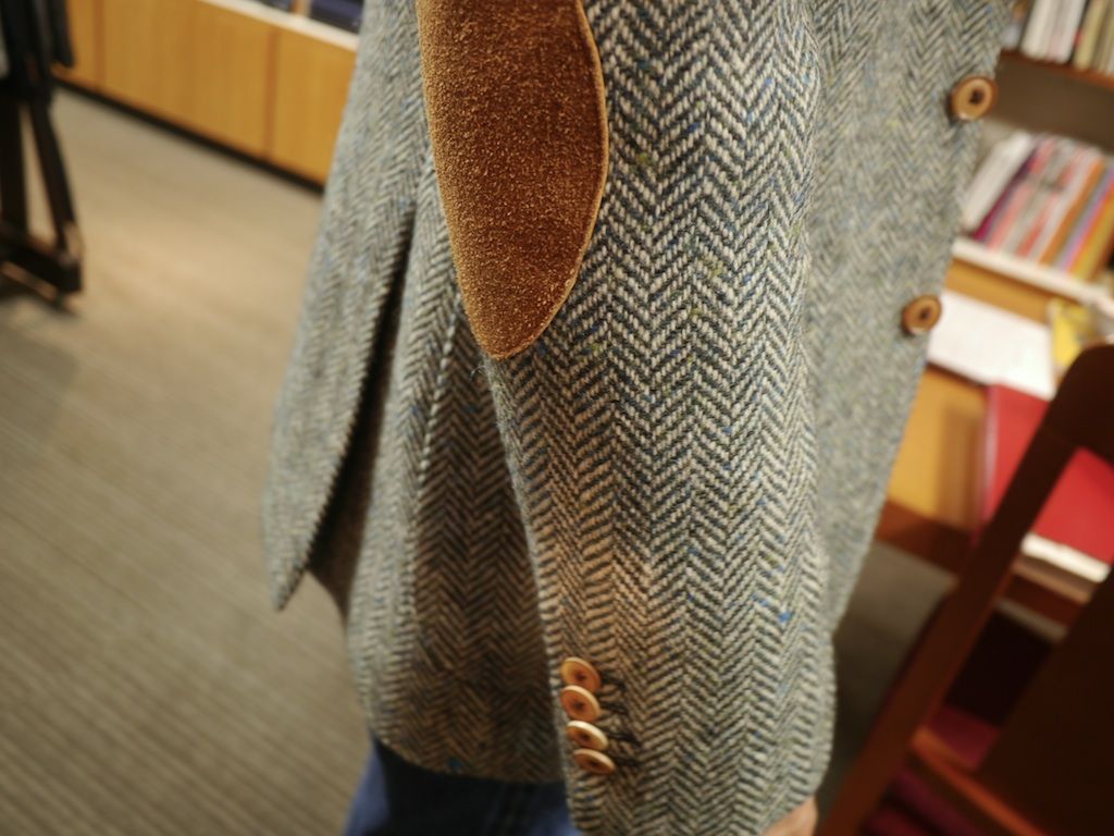 知り合いのテーラーが廃業するので服地を買い取ったのが数年前のこと。古い服地ばかりで今の時代には使えない素材も多かったが、上品なテーラーだったのでいい趣味のヴィンテージ服地も幾つか含まれていた。ふとひらめいて先日ハリス・ツイードをオーダーにご来店いただいたお客様に買い取った服地の中のネップの入ったグリーンのヘリンボーンツイードをおすすめした。当然お客様には事情も話し、テーラーさんからもけっして高い金額で買い取ったわけではないので格安に価格は設定した。お客様はそのストーリーに興味をお持ちいただきオーダーをいただくことになりそしてこのたび完成した。 この素材はきっと30年以上前に織られた服地で、仕立てることによって新たな命を吹き込まれたということになる。シェイプは昔と違い柴山先生監修のクラシックなシェイプでサイジングも適正、ナットボタン、革のエルボーパッチ、マリックの裏地など極上のパーツばかり。長く愛用していただくと幸いです。