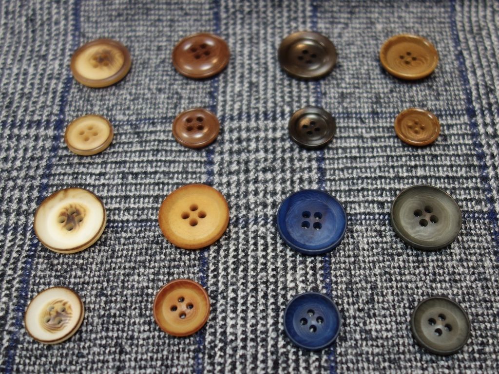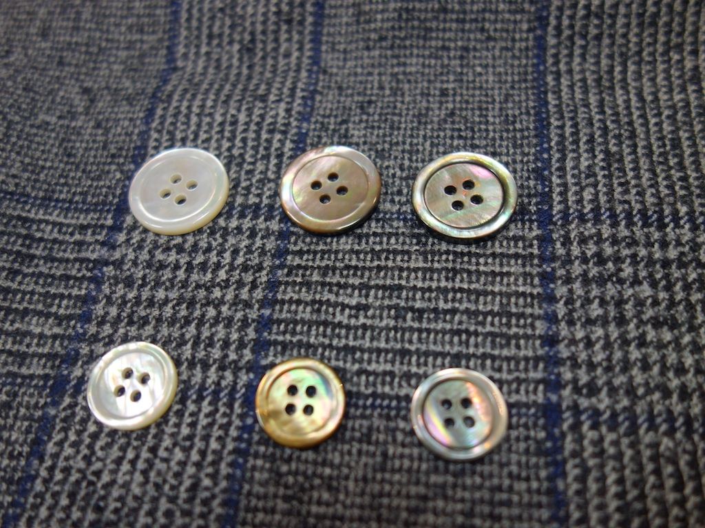 当店でオーダーしたお客さまの洋服はすべて天然ボタンをつけることにしています。ヨーロッパでは高級なスーツに石油製品であるプラスチック製を使うことはまずありえません。プラスチック製ボタンをつかうことでそのほうが欠けにくいかもしれませんが、せっかく仕立てが良いスーツでもチープに見えてしまうのは、やはりよくない。