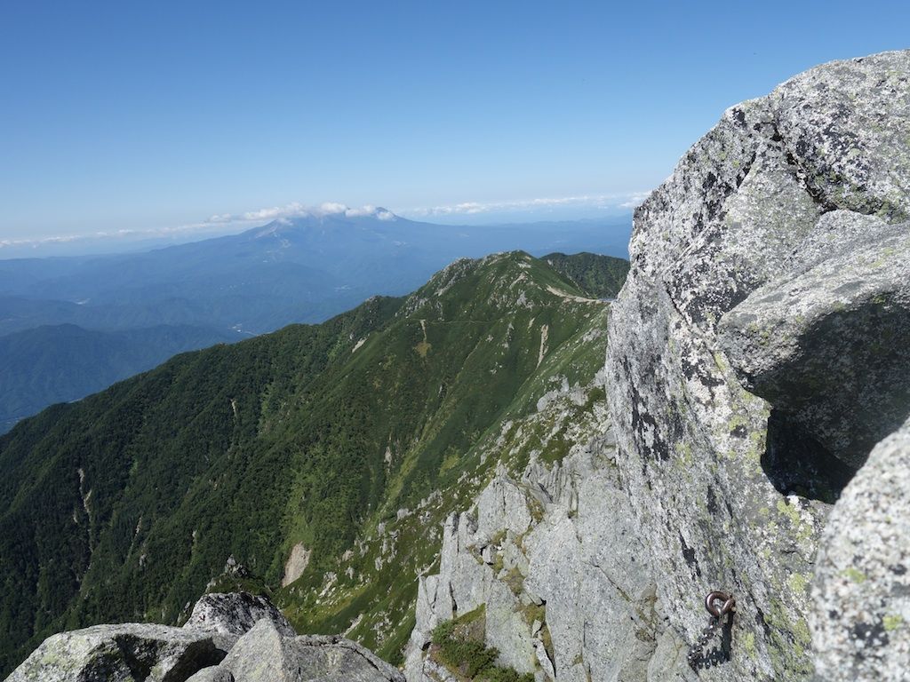 御嶽山がすぐそこ。下は断崖で鎖を伝って上へ。