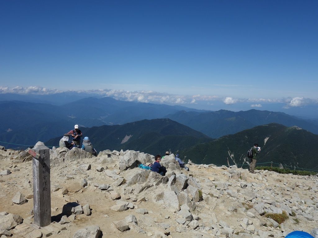 それから駒ケ岳の頂上を目指す。「難所有り」の看板もある巻き道を通ったほうが近いことを知っているので岩場もある道を経て駒ケ岳の頂上に着く。おかげさまで天気は上々、360°の眺望がすばらしくそれがいちばんのごちそう。秋の澄んだ空気を肺いっぱいに吸い込んで下山の途につきました。