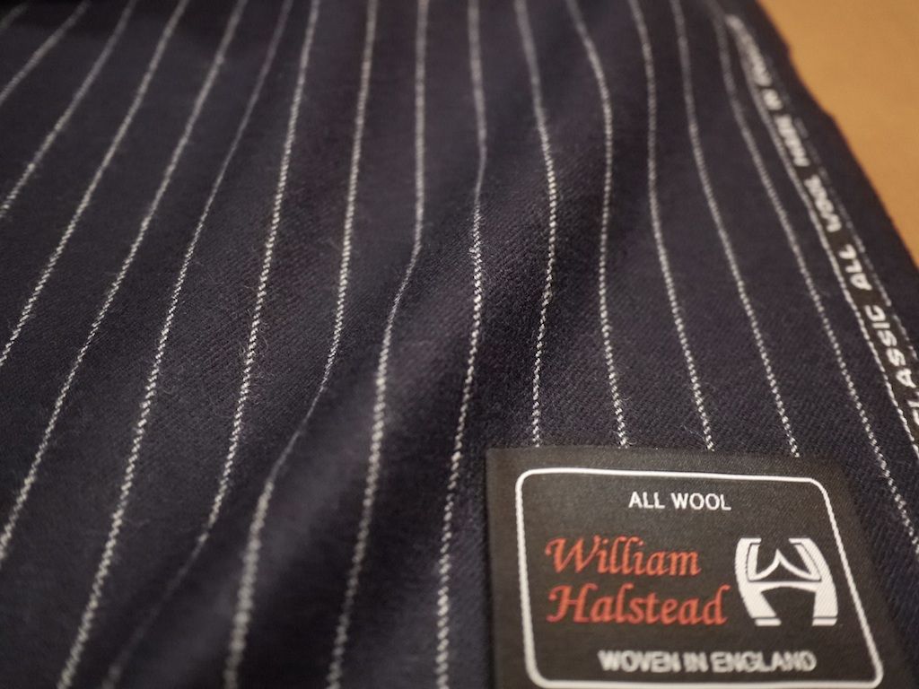 英国ハルステッド社のフランネル「ブリティッシュ・クラシック」。17mm巾の白いチョークストライプの表現が素敵だったので買いつけました。英国ムードあふれるダブルブレストのスーツ、スリーピース・スーツに仕立て上がります。ウール100%で320g/m前後です。ネイビー、ミディアムグレー、ダークグレーの3色ございます。