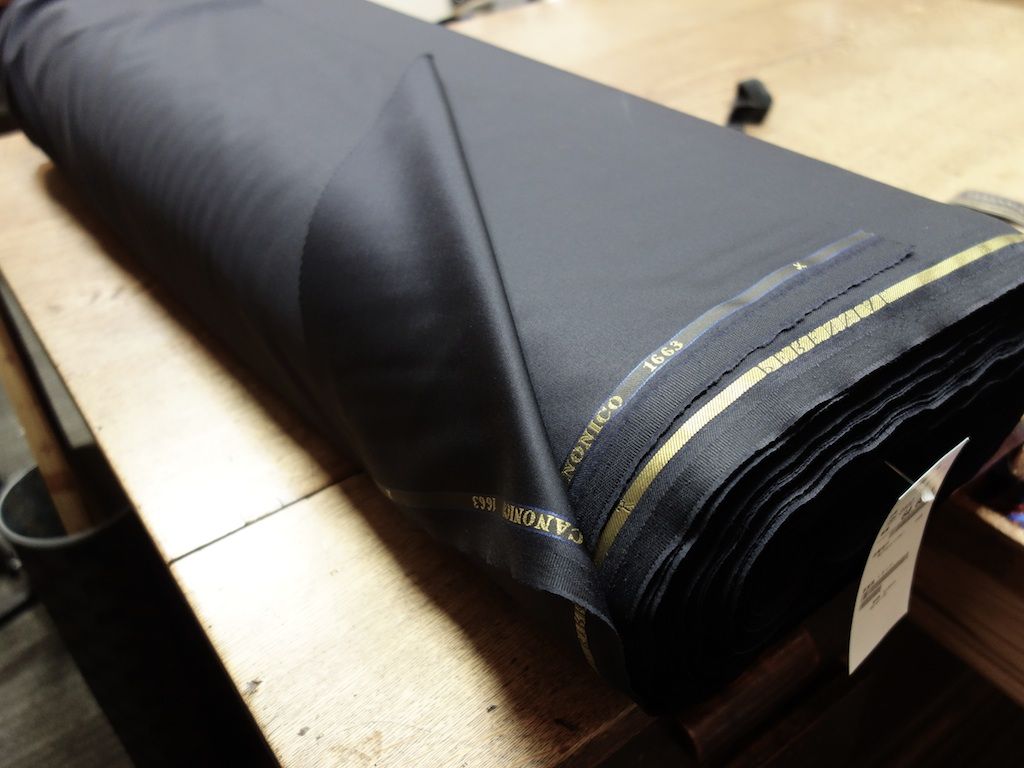 今年当店でベストセールスを記録したのはヴィターレ・バルベリス・カノニコ社のスリーシーズン素材、スーパー110`sツイル無地「PERENNIAL」。6月末から販売を開始して以来、ブラック無地は75mの反を2反完売して、いまは3反めに入っています。濃紺無地もあと2着で2反完売となります。人気の秘密はリーズナブルなオーダースーツ価格59800円(税込)ながらエレガントなツヤと柔らかい着心地があること。1mあたり260gでスリーシーズン着られる使いやすさもある。当店なら天然ボタン、キュプラ100%裏地、本切羽そして本バス毛芯仕立てが標準仕様なのでホントにステキなスーツに仕立上がります。