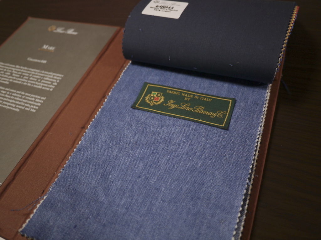 春のおすすめ第一弾はイタリアロロピアーナ社のオシャレな素材。リネンコットンデニム。リネン68%、31%にポリウレタン1%加えストレッチ性を持たせています。このデニム素材がおしゃれなのは1mあたり490gと目付けがしっかりあること。このウェイトのおかげで落ち感もきれいですしリネン特有のシワも美しく表現されます。ちょっと早めにリネンを着るとファッション感度の高い人だなと認識されることもあると思います。まとめて買いつけたのでお求めやすいスペシャルプライス。ロロピアーナのバンチサンプル、Mare Collezione648 に所収です。