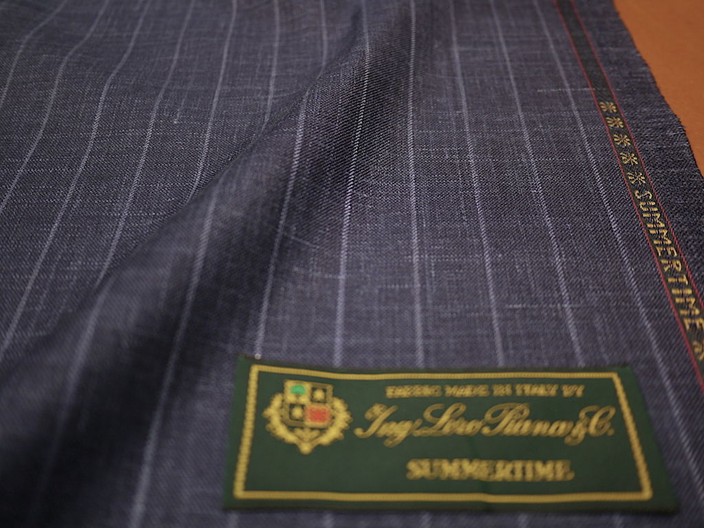 ロロピアーナの春夏ウールリネンのおしゃれジャケット素材、サマータイム。ことしはスーツに使える素材が新発売となりました。1mあたり245gのツイル(綾織)の春素材。ウール67%にツヤ出しのためシルクを20%加え、リネンを13%加えました。かすりのようなヴィンテージな表面感がオシャレなサックス色の19mmストライプ素材です。ストライプ素材のジャケットはおしゃれ度の高いアイテムです。ヌケ感のあるカジュアルなアンコン仕立てがおすすめ。夏のジャケットかセットアップスーツをお楽しみください。
