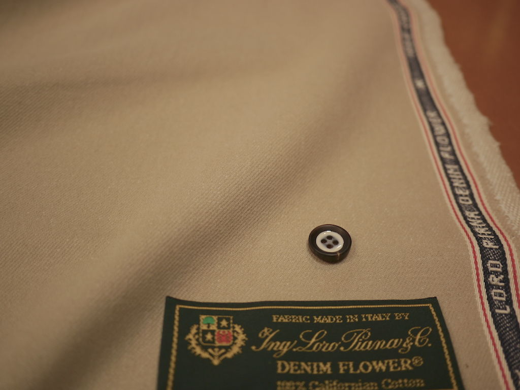 デニムフラワーは「LORO PIANA」の名前入りの織り耳を持つ、レアなデニム素材です。この織り耳をひとつループにあしらうことが出来ます。お申し付けくださいませ。