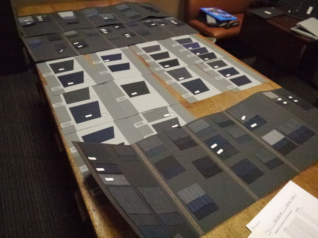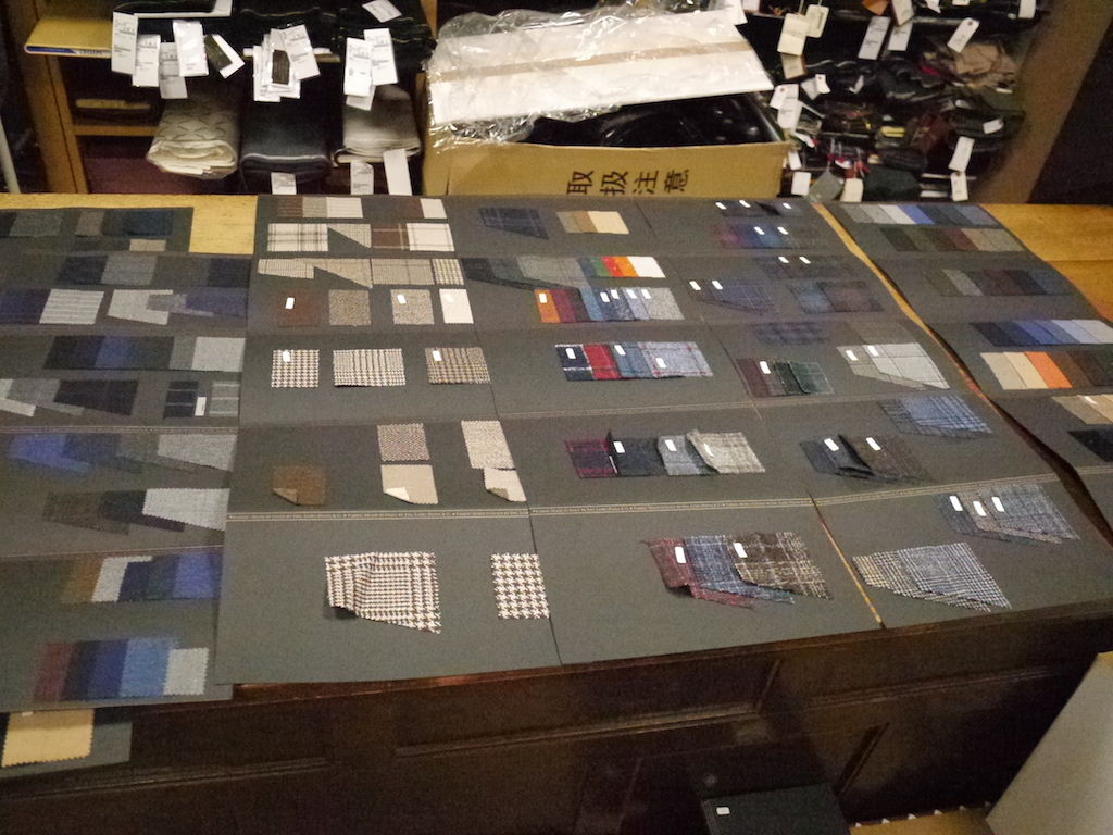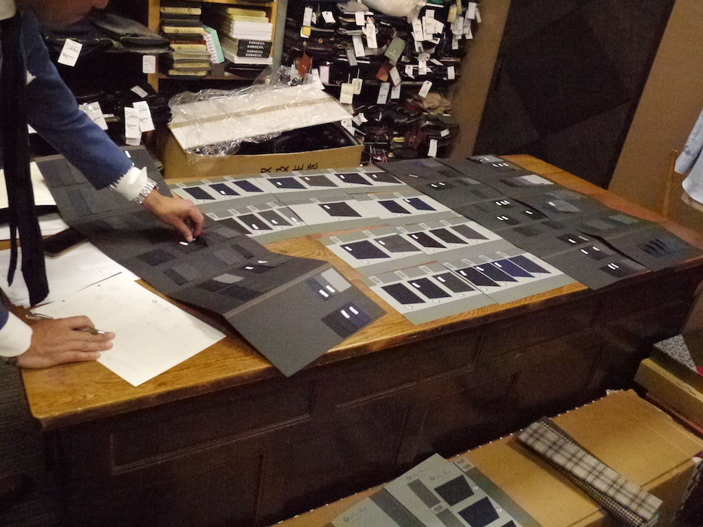 スーツ素材も裁断台に並べて、買いつける分を決めます。