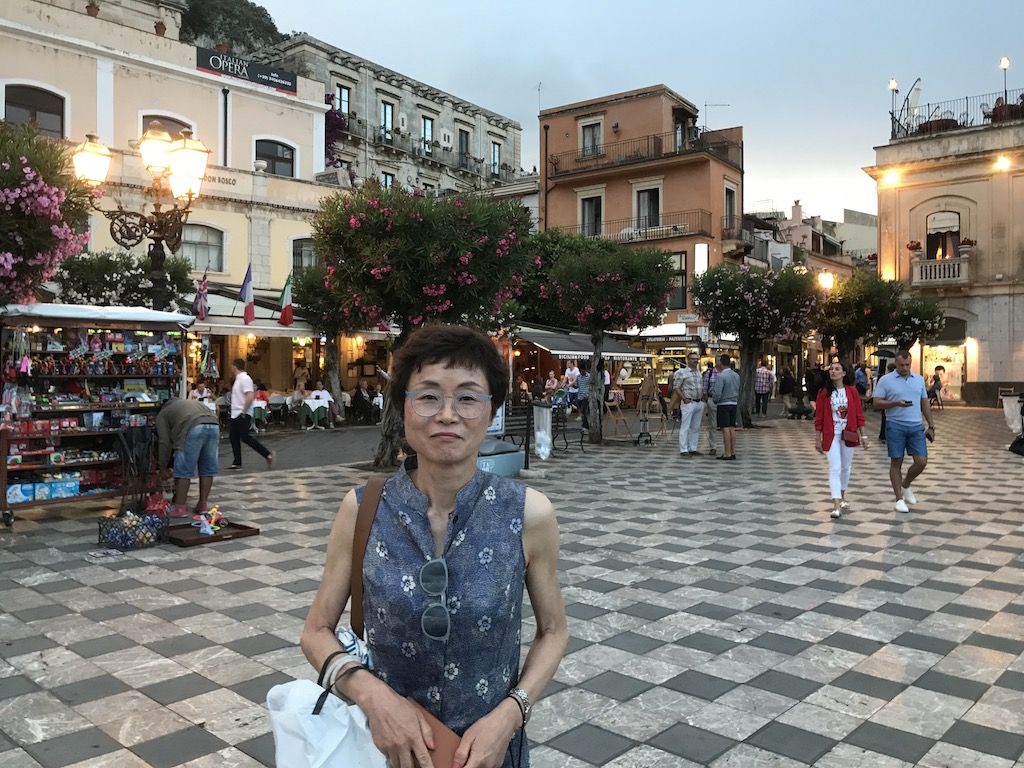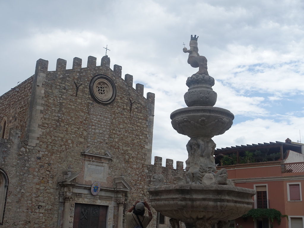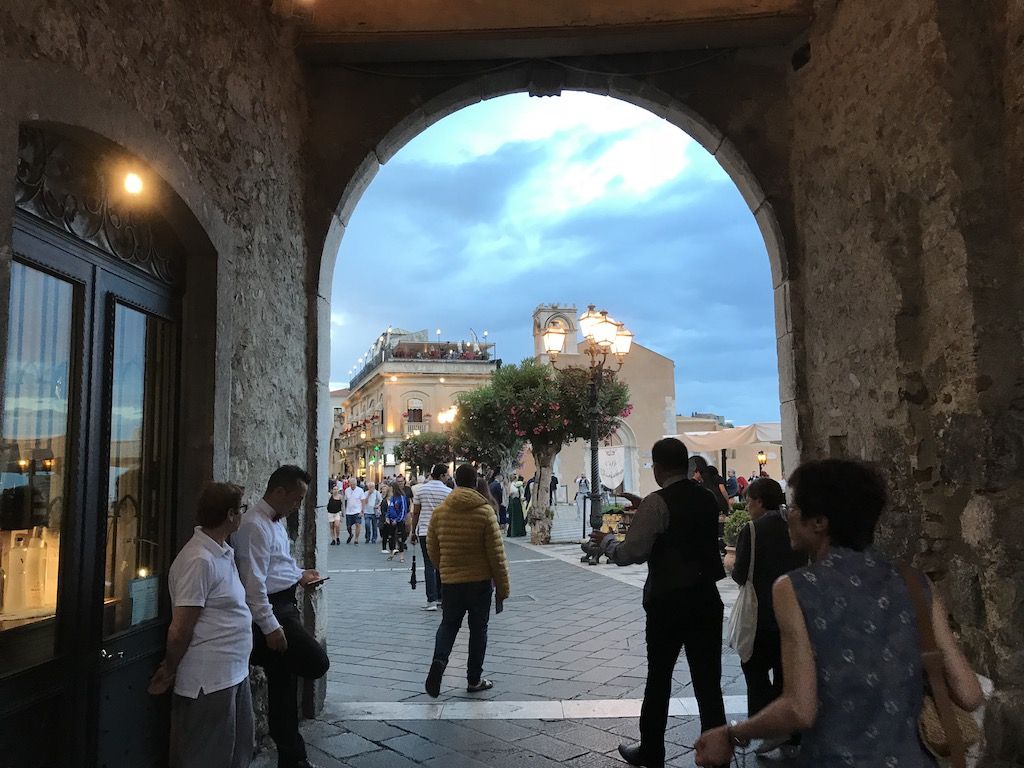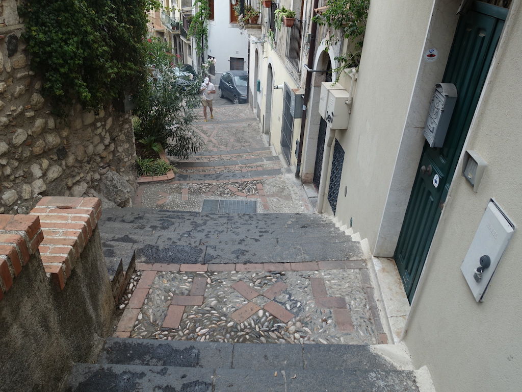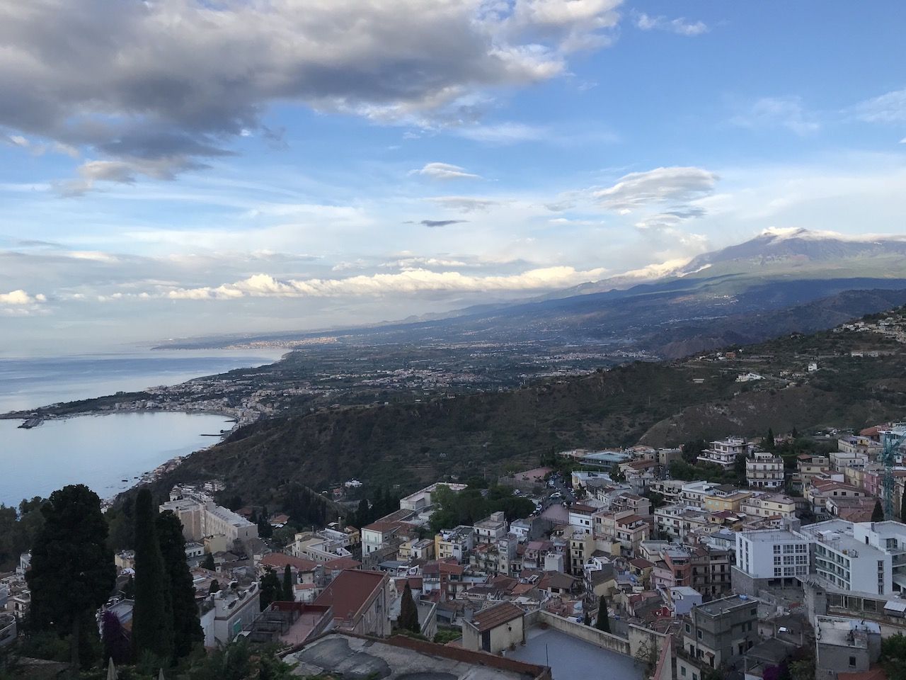 二枚の素晴らしい絵を見た感激を胸に、タクシーは雨の中40分走り、この日泊まるタオルミーナ着。曲がりくねった坂道にあるホテルに着いたときまだ雨でまわりは見えませんでした。どんなところに着いたのだろうとよくわからないまま低テンションで部屋に入ってしばらくして窓の外を眺めていたら空が晴れて、空と海と山がせめぎ合う絶景が目に飛び込んできました。こ、ここは一体??私が過去見た絶景の中でも最高かもしれません。タオルミーナを多くの人が讃える理由が一瞬でわかりました。当然テンションはピンと高くなり、石段を降りたところにあるタオルミーナの街に駆けて行きました。