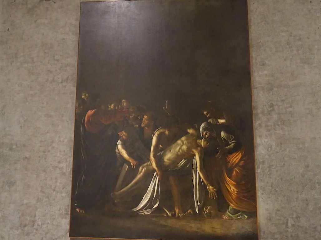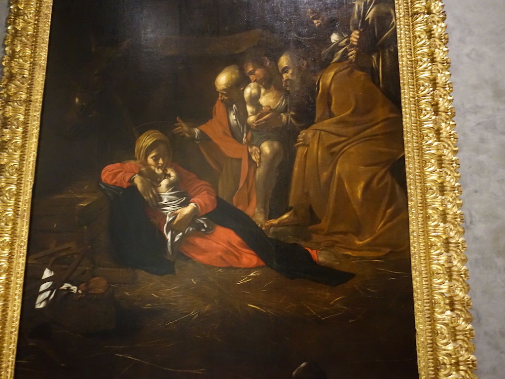 美術館の中で地元の画家や彫刻家の作品を眺めながらカラヴァッジョはどこかなと探すとそれらしき作品群が展示してある部屋を見つけました。カラヴァッジョかなと思われる絵はカラヴァッジョに似た絵でしたがカラヴァッジョではありません。そこでふと脇の小さな階段を見つけそ登るとコンクリート打ちっぱなしの空間についにありました。カラヴァッジョの偉大な絵が二枚。「ラザロの復活」「羊飼いの礼拝」カラヴァッジョの画家としての円熟期に書かれたこの絵はどちらも教会の依頼で祭壇画として書かれているので大きなものです。教会が改修や荒廃してこの美術館に来たそうです。