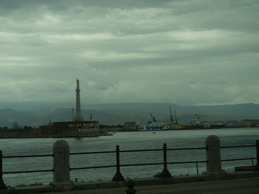 深く雲が垂れ込めるメッシーナ。対岸はイタリア半島、メッシーナの灯台が見える。