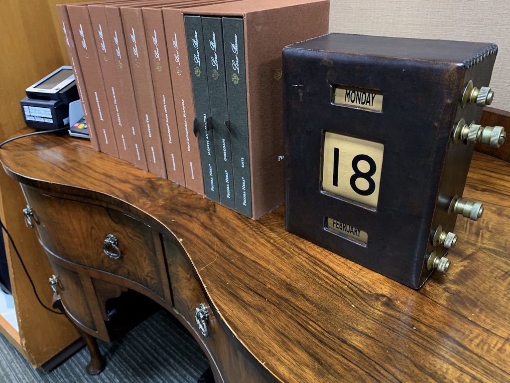 オーダースーツ納期表示機は神戸ロイズアンティークショップでみつけました。今ですとオーダースーツの納品は2月18日となります。