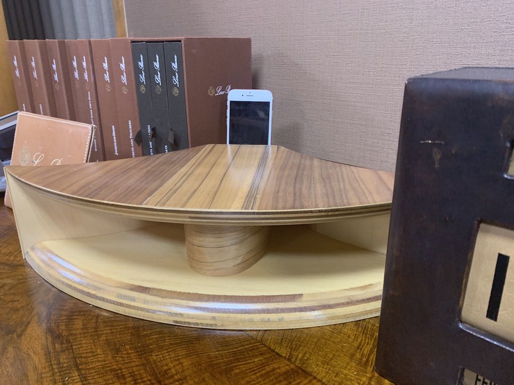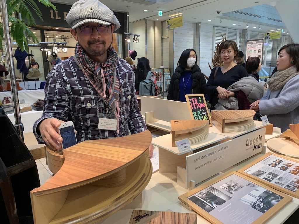 ラシック一階を歩いていたら若い職人さんが作ったモノのイベントをなにげなくながめていたら木で作られたホーンのようなものがありました。ちょっとおもしろそうで眺めていたらどうやらIPHONE用のスピーカーでした。電源やアンプはなくて置くだけで音が大きくなるとのこと。試してみると案外音も悪くありません。形があのJBLの銘器パラゴンみたいですねとたずねたら、その若い職人さん、Clappin Jam Wood主宰の原田さんは実はパラゴンを同寸で自作したんですよと笑っていました。試聴していたら結局買ってしまいました。帰宅して聞いていますがIPHONE本体の小さいスピーカから流れる無機質な音がアコースティック感のある音になって楽しめます。