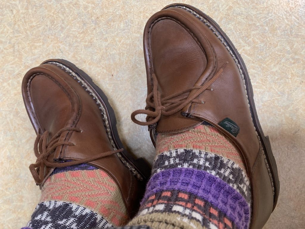 パリ、サンジェルマンデプレでフランス製の革靴を2足買った。一足はJ.Mウェストンのお店でローファーを620ユーロ、もう一足はパラブーツのお店でミカエルを320ユーロ。J.Mウェストンはスウェードのローファーを持っているので同じサイズのブラウン表革の6/Eにした。いま持っているローファーはちょっとゆるいくらいだがこれはきつくて厳しい。革靴であるローファーの裏は邪道かもしれないが、松坂屋の山崎靴店でビブラムの滑り止めをいつも貼ってもらっている。新品のうちにクリームを塗って磨いたりあたって痛い箇所をドライヤーで温めたりはたで見ていると涙ぐましいほど。今はずっと足が痛いがなにしろ毎朝履いて伸ばしているので、いつかは快適なスッキリした履き心地になるはずで楽しみだ。ミカエルは買ってからリュー・ド・バック近くのホテルで夜履きながら寝たりして慣らしてきたし、ラストも広いのでもうかなり履きやすくなってきた。